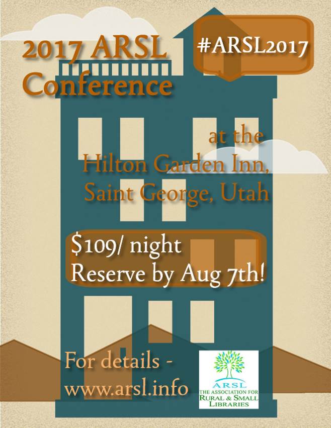 Hi, If you're going to the ARSL conference, you'll want to know about this: The Association for Rural & Small Libraries Conference housing is now open for reservations. Rooms at ARSL sell out fast, we encourage you to book your room today and join us for ARSL2017 in beautiful St. George, UT. The Hilton Garden Inn is our conference hotel this year with a rate of $109 per night. Book your reservation <http://hiltongardeninn.hilton.com/en/gi/groups/personalized/S/SGUGIGI-ARSL-20170905/index.jhtml> now. Room rates are available for extended nights prior to and after conference. Our online code should show up automatically but it’s ARSL just in case you need it. You can also book by calling 435-634-4100 <%28435%29%20634-4100> to make your reservation. Be sure to tell the agent you are attending the ARSL Conference to get the discount. Booking early also ensures you get the room preferences you need, particularly for sharing with a friend or colleague. The overflow hotel is the Holiday Inn in St. George: *Book your room here <https://www.holidayinn.com/hotels/us/en/st-george/sgudx/hoteldetail?qAdlt=1&qBrs=6c.hi.ex.rs.ic.cp.in.sb.cw.cv.ul.vn.ki.sp.nd.ct&qChld=0&qFRA=1&qGRM=0&qGrpCd=ARL&qIta=99801505&qPSt=0&qRRSrt=rt&qRef=df&qRms=1&qRpn=1&qRpp=20&qSHp=1&qSmP=3&qSrt=sBR&qWch=0&srb_u=1&icdv=99801505>*. Room code is ARL. If you prefer to book by phone, call 435-628-8007 <1%20435%206288007> and mention you are attending the ARSL Conference for the $109 rate. Both hotels are within walking distance of the Conference Center. Contact Vicki Bartz, 2017 Conference Chair, with questions: vbartz99@gmail.com. See you in St. George! Thanks, Colleen Colleen Leddy, Director Stair District Library 228 W. Main St. Morenci, MI 49256 517/458-6510 Monday & Wednesday: 10 a.m. to 7 p.m. Tuesday, Thursday, Friday: 1 to 5 p.m. Saturday: 9 a.m. to 1 p.m.