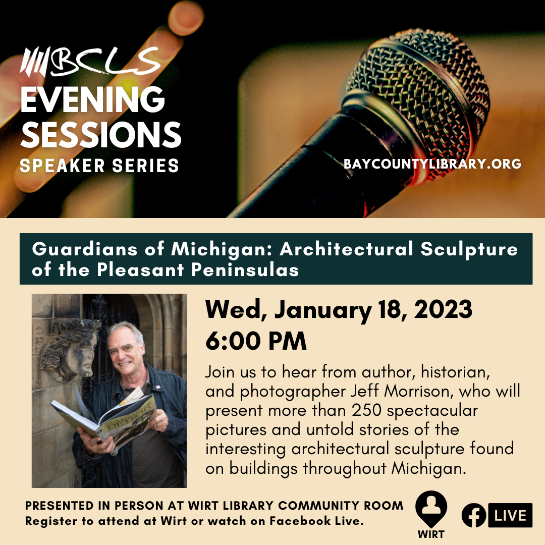 Join us at the Alice & Jack Wirt Library tomorrow, January 18, 6:00 pm to hear from Michigan Notable Book author Jeff Morrison! He will be presenting on his book Guardians of Michigan: Architectural Sculpture of the Pleasant Peninsulas. It will also be live streamed on our Facebook page. More information can be found on our event calendar here: https://www.baycountylibrary.org/event/evening-sessions-guardians-michigan-a... Kirsten Wellnitz Managing Librarian Alice & Jack Wirt Library 500 Center Ave. Bay City, MI 48708 989-893-9566 ext. 2111