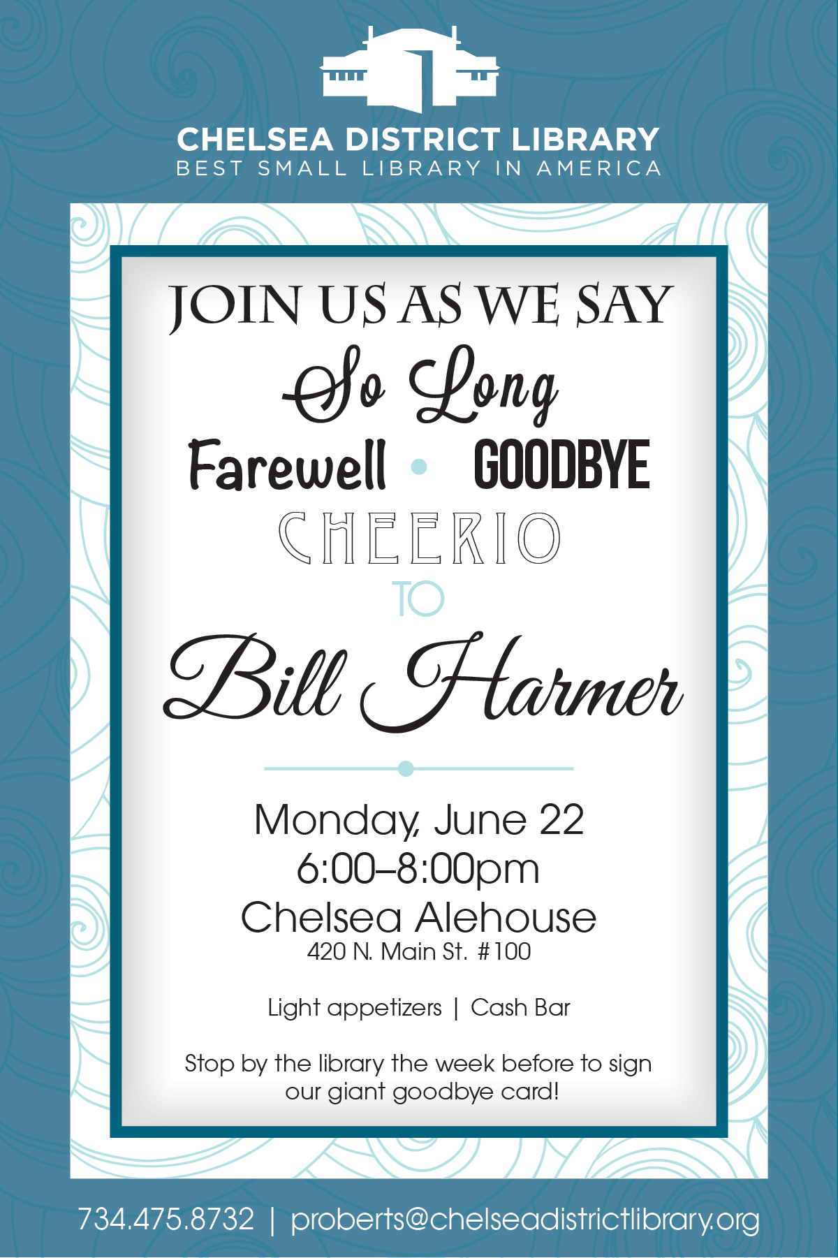 We're having a party to say goodbye to Bill and his family! We hope you'll join us. <proberts@chelseadistrictlibrary.org> <proberts@chelseadistrictlibrary.org> Patty Roberts | Marketing Coordinator Chelsea District Library | 221 S. Main St. Chelsea, MI 48118 734.475.8732 ext. 216 | proberts@chelseadistrictlibrary.org