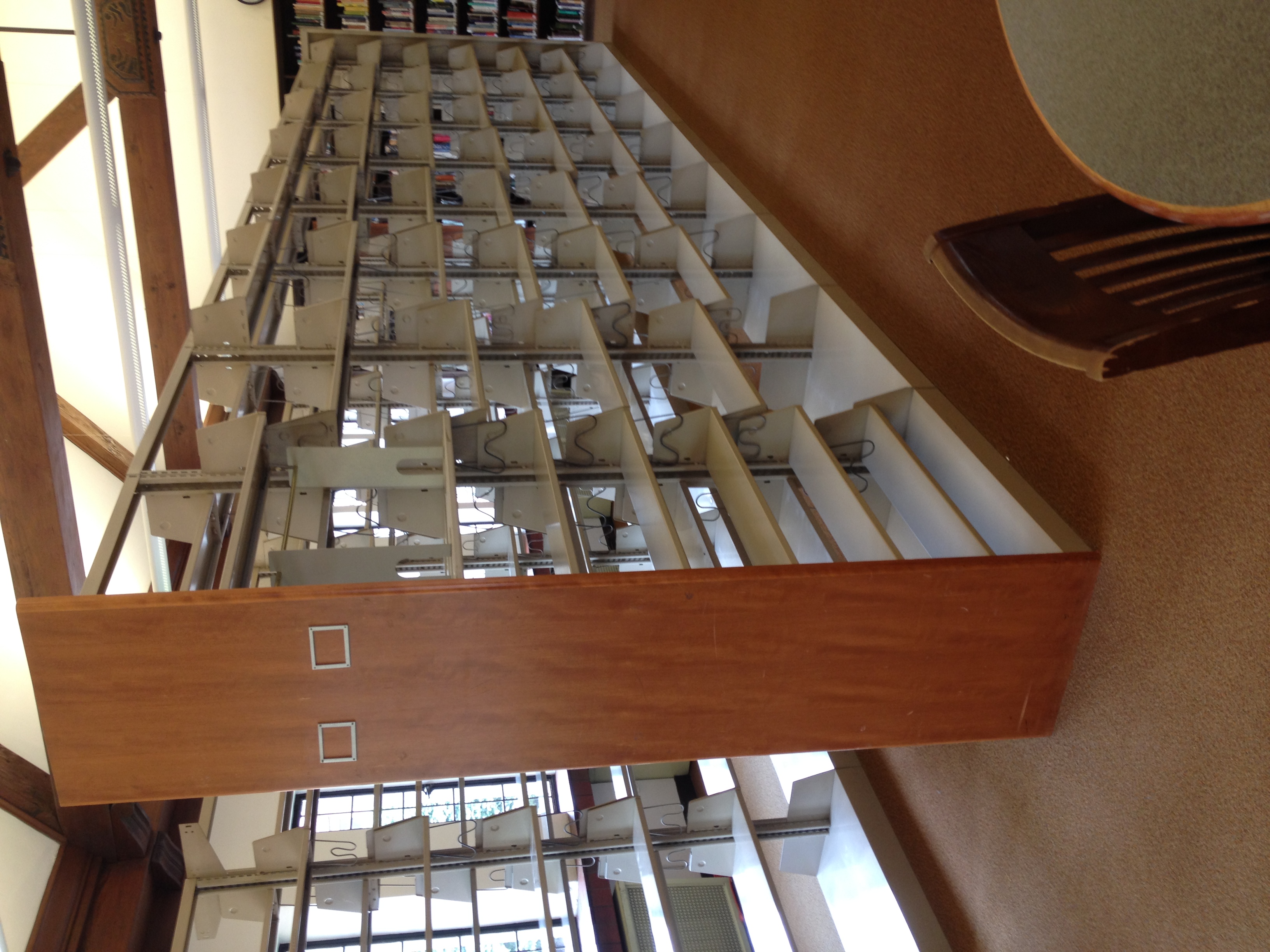 I have two shelving units available (see attached picture). They are double-sided, 24 feet long, made up of 3 foot sections so could be shorter if you wanted. You'd have to come get them - we are in Bloomfield Hills. Linda Stone