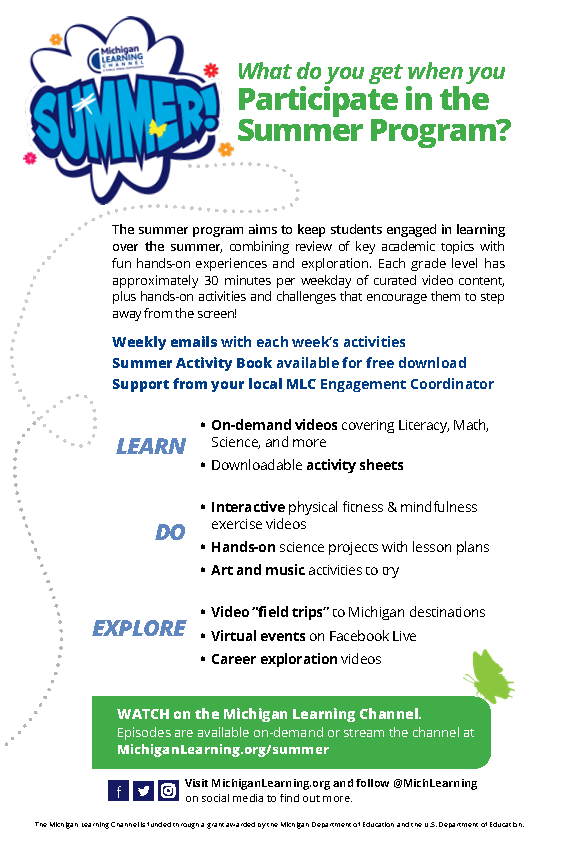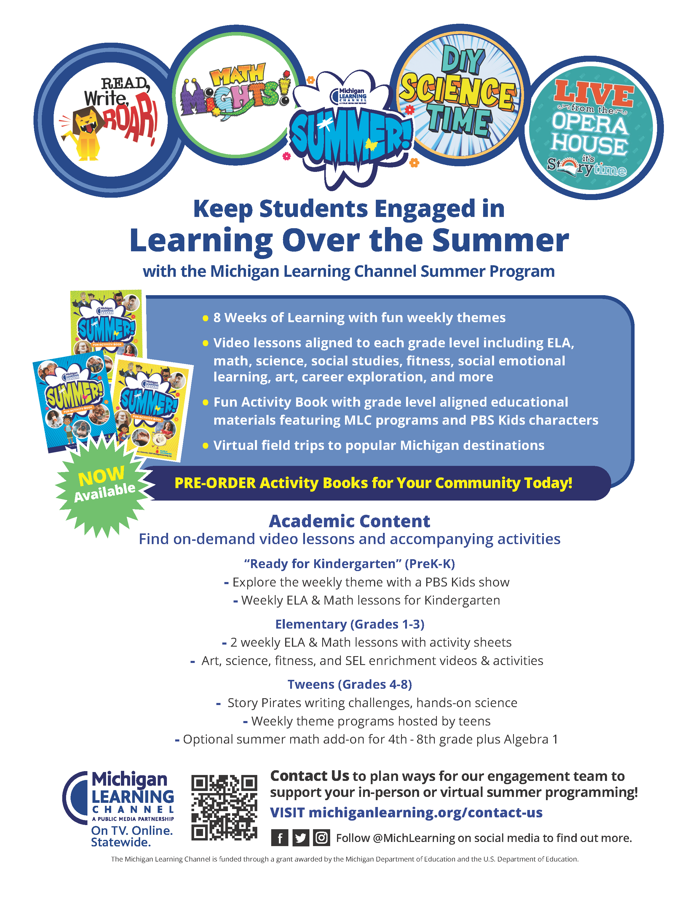 The Michigan Learning Channel<https://gcc02.safelinks.protection.outlook.com/?url=https%3A%2F%2Fwww.michiganlearning.org%2F&data=05%7C01%7CLancasterC5%40michigan.gov%7C297b10f430ff4bf68dce08db1502a84b%7Cd5fb7087377742ad966a892ef47225d1%7C0%7C0%7C638126873398426536%7CUnknown%7CTWFpbGZsb3d8eyJWIjoiMC4wLjAwMDAiLCJQIjoiV2luMzIiLCJBTiI6Ik1haWwiLCJXVCI6Mn0%3D%7C3000%7C%7C%7C&sdata=wNVBr%2BI53WYTTRkvP2CPrlt31aXhQcIMzSGeNxHSKII%3D&reserved=0>, your statewide preK-12 educational programming hub, will be running our third annual "Summer is Fun" program, running mid-June through August 2023. Our goal is to support families, out-of-school programs, and libraries with quality programming and resources that encourage fun, community building, and learning all summer long. A huge component of our programming is our 100-page summer activity book series that we curate for preschool learners, early elementary learners, and upper elementary/early middle school young people. The three different books include activity pages for learning in literacy, math, science, and other content areas alongside fun, local, outdoor activities from Michigan organizations and PBS. All activity pages within the books link directly to a video and resource on our website so that families can engage with our video learning content while participating in hands-on activities. We also align the activity books with our broadcast TV schedule that reaches audiences across the state, with academic learning standards, and with the national CSLP theme "All Together Now." We would love to partner with your library to bring our summer activity books and more to your communities! If you are interested in ordering books for your families, please use this link<https://gcc02.safelinks.protection.outlook.com/?url=https%3A%2F%2Fwww.michiganlearning.org%2Fsummer-2023%2F&data=05%7C01%7CLancasterC5%40michigan.gov%7C297b10f430ff4bf68dce08db1502a84b%7Cd5fb7087377742ad966a892ef47225d1%7C0%7C0%7C638126873398426536%7CUnknown%7CTWFpbGZsb3d8eyJWIjoiMC4wLjAwMDAiLCJQIjoiV2luMzIiLCJBTiI6Ik1haWwiLCJXVCI6Mn0%3D%7C3000%7C%7C%7C&sdata=Ofznc4mEvJuw%2FbsKIutO%2B%2B4kpXipPm0gtLMSi3CcBqs%3D&reserved=0> to "pre-order" so that we can be in touch when we have a live order form. We are excited to provide books at a discounted bulk rate that will ship directly to your library. We can also provide a print-ready file in early April if you are able to print your own copies to share in your communities. Finally, if you do not have the budget to print or order the physical books, please reach out to me so that I can connect you with a local engagement team member who can hopefully bring some extra copies to you - we have a limited supply this year but would love to build a strategy for leveraging libraries as distribution sites around the state. We are excited to partner with as many libraries as possible this summer! Please reach out if you have any questions about the activity books, our broadcast and digital programming, or if you have ideas for in-person or virtual programs that our engagement team can support - we love bringing Michigan Learning Channel and PBS Kids to Michigan communities! Thank you, Matt Hamilton (he/they) Program Director, Michigan Learning Channel<https://gcc02.safelinks.protection.outlook.com/?url=http%3A%2F%2Fmichiganlearning.org%2F&data=05%7C01%7CLancasterC5%40michigan.gov%7C297b10f430ff4bf68dce08db1502a84b%7Cd5fb7087377742ad966a892ef47225d1%7C0%7C0%7C638126873398426536%7CUnknown%7CTWFpbGZsb3d8eyJWIjoiMC4wLjAwMDAiLCJQIjoiV2luMzIiLCJBTiI6Ik1haWwiLCJXVCI6Mn0%3D%7C3000%7C%7C%7C&sdata=wrixBZEDh0QjFsJxBxzpXhP2m441ddA0%2Fz39PBsFmFA%3D&reserved=0> [Learn more about the new Michigan Learning Channel]<https://gcc02.safelinks.protection.outlook.com/?url=https%3A%2F%2Fwww.michiganlearning.org%2F%3Femailsig&data=05%7C01%7CLancasterC5%40michigan.gov%7C297b10f430ff4bf68dce08db1502a84b%7Cd5fb7087377742ad966a892ef47225d1%7C0%7C0%7C638126873398426536%7CUnknown%7CTWFpbGZsb3d8eyJWIjoiMC4wLjAwMDAiLCJQIjoiV2luMzIiLCJBTiI6Ik1haWwiLCJXVCI6Mn0%3D%7C3000%7C%7C%7C&sdata=AKk7Iye8qo3zjNZ7iJQoz6%2BPE4ID8feHFHjOt25ANPM%3D&reserved=0> Partnering with teachers and families. On TV. Online. Statewide. Visit MichiganLearning.org and Watch Live<https://gcc02.safelinks.protection.outlook.com/?url=https%3A%2F%2Fwww.michiganlearning.org%2F%3Femailsig&data=05%7C01%7CLancasterC5%40michigan.gov%7C297b10f430ff4bf68dce08db1502a84b%7Cd5fb7087377742ad966a892ef47225d1%7C0%7C0%7C638126873398426536%7CUnknown%7CTWFpbGZsb3d8eyJWIjoiMC4wLjAwMDAiLCJQIjoiV2luMzIiLCJBTiI6Ik1haWwiLCJXVCI6Mn0%3D%7C3000%7C%7C%7C&sdata=AKk7Iye8qo3zjNZ7iJQoz6%2BPE4ID8feHFHjOt25ANPM%3D&reserved=0>