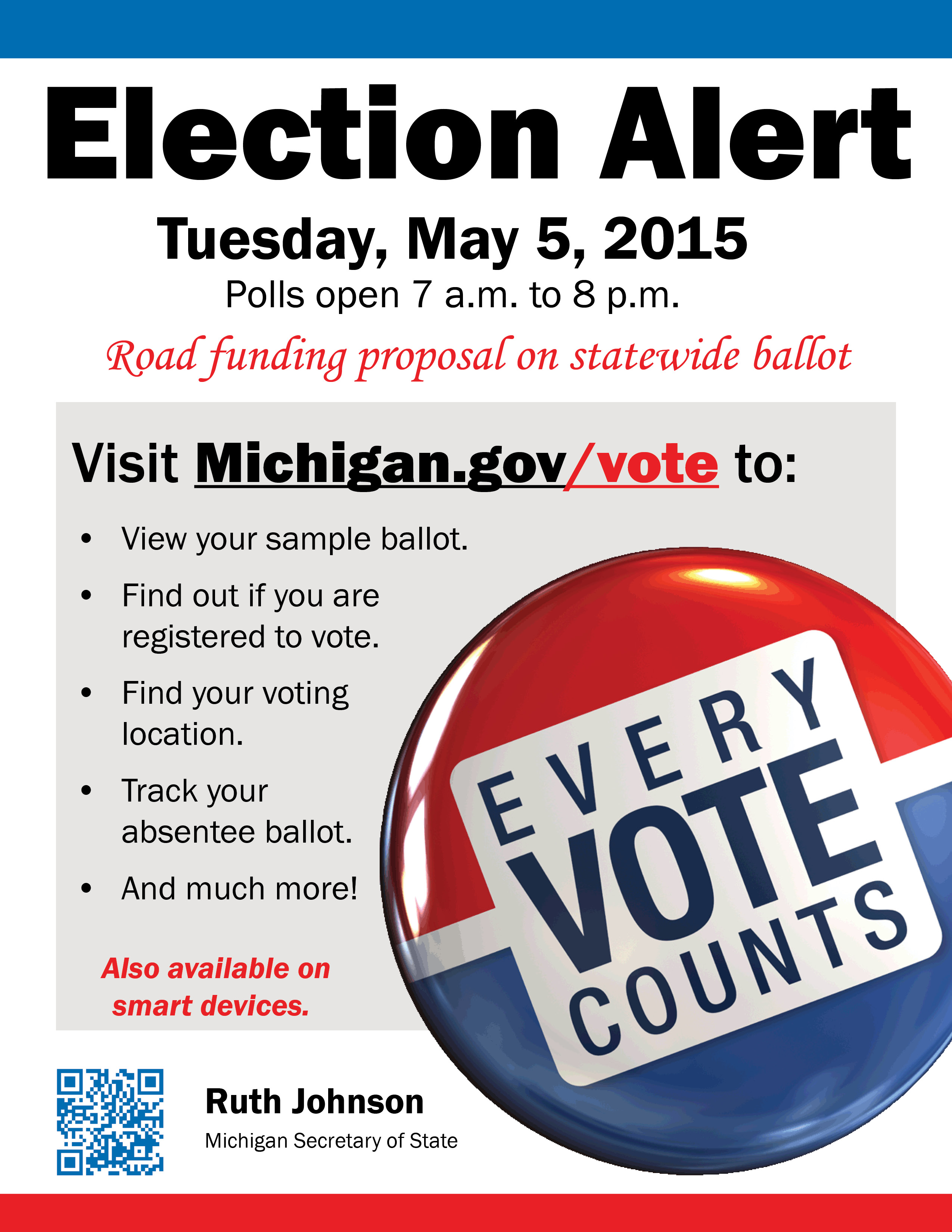Hello! In the next day or two, I am hoping you can share the following brief messages via social media or on your website concerning the May 5 statewide election. I've also attached a flyer that you can post or put up on your website to alert your patrons that an election will be taking place. As always, any help you can provide will be greatly appreciated! Website or Facebook Message: Time Running Out to Register to Vote for Election on May 5 If you are not a registered voter, you have until Monday, April 6 to register if you want to vote in the May 5 statewide election. Michigan residents can register by mail or in person at their county, city or township clerk's office or by visiting any Secretary of State office. The mail-in form is available at Michigan.gov/elections<http://www.michigan.gov/elections> and must be postmarked by April 6. Twitter Message: #Voter registration deadline for May #election in Michigan is April 6 Thanks so much for your support! Cathleen P. Simlar Communications Specialist, Executive Office Michigan Department of State Office: (517) 373-9080 Cell: (248) 761-7145 Email: Simlarc@michigan.gov<mailto:Simlarc@michigan.gov> Join My Professional network on LinkedIn<blocked::http://www.linkedin.com/pub/cathleen-simlar/18/798/235> [Description: Description: Description: SOS logo small] <http://www.michigan.gov/sos> STAY CONNECTED: [Description: Description: Description: Facebook logo]<http://www.facebook.com/MichiganSoS> [Description: Description: Description: Twitter logo] <https://twitter.com/michsos> [Description: Description: Description: YouTube logo] <http://www.youtube.com/michsosoffice> [Description: Description: Description: GovDelivery logo] <https://public.govdelivery.com/accounts/MISOS/subscriber/new>