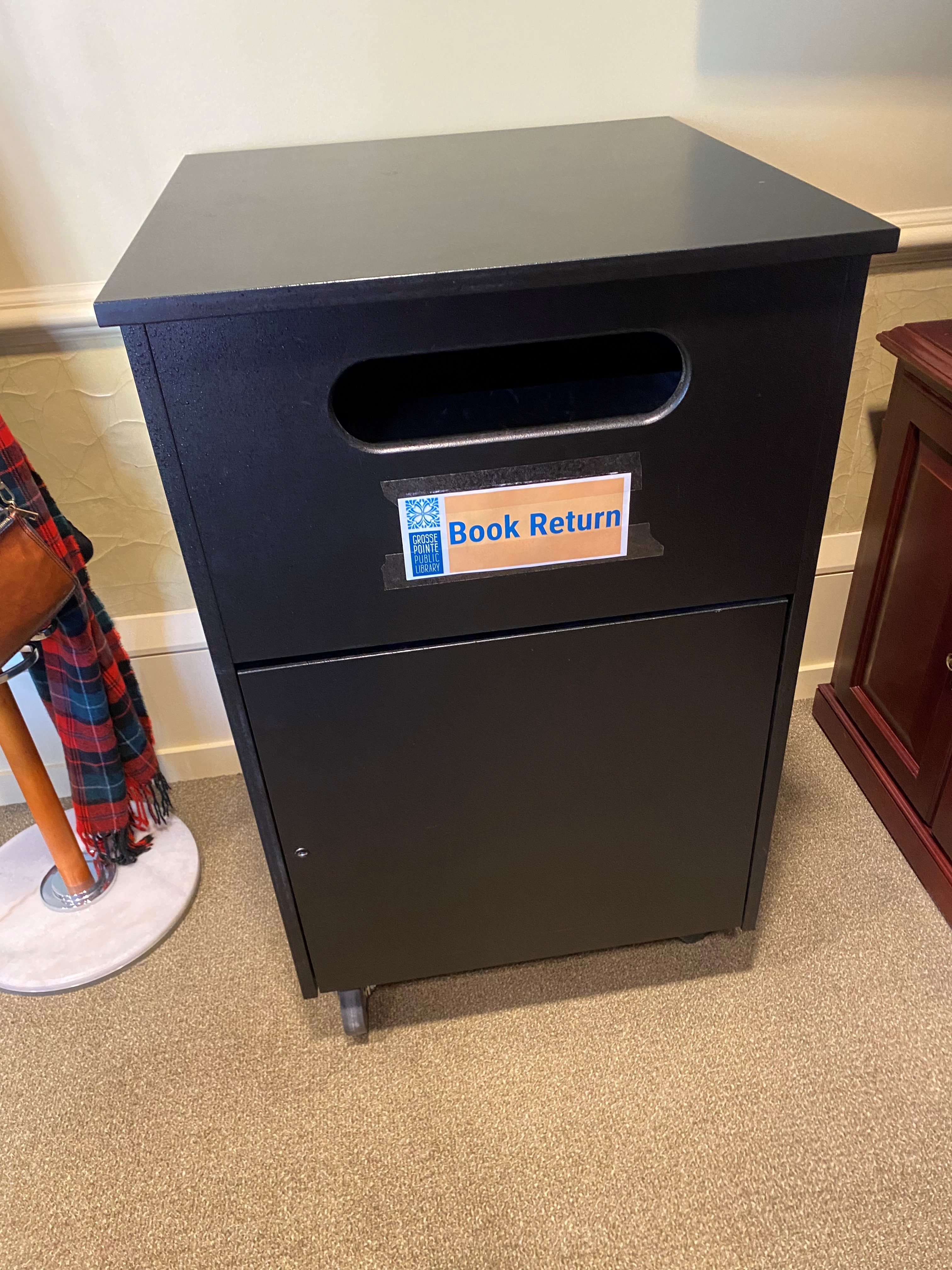 Happy Wednesday! The Grosse Pointe Library has an indoor book return box for sale. Pick-up only! 36 inches high by 24 inches deep by 24 inches wide. Please let me know if you're interested! [cid:image001.jpg@01D9E62E.CE347A10] [cid:image003.jpg@01D9E62E.CE347A10]KIM HART OPERATIONS MANAGER 313.343.2325 Expand learning, inspire creativity and connect our community grossepointelibrary.org