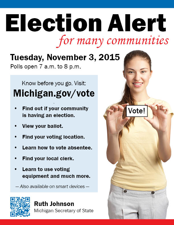 Hello! In the next day or two, I am hoping you can share the following brief messages via social media or on your website concerning the November 3 elections that are happening in 74 of Michigan’s 83 counties. To find out if there’s an election in your area, click here<http://www.michigan.gov/documents/sos/Elections_by_County_444556_7.pdf?20150929104413>. I’ve also attached a flyer that you can post or put on your website to alert your patrons about the election. As always, any help you can provide will be greatly appreciated! Website or Facebook Message: Time Running Out to Register to Vote for Election on Nov. 3 If you are not a registered voter, you have until Monday, October 5 to register to vote for the November 3 election in your community. Michigan residents can register by mail or in person at their county, city or township clerk’s office or by visiting any Secretary of State office. To find out if your community is holding an election on November 3, click here<http://www.michigan.gov/documents/sos/Elections_by_County_444556_7.pdf?20150929104413>. . Twitter Message: #Voter registration deadline for November #election in Michigan is Oct. 5. Thanks so much for your support! Cathleen Simlar Cathleen P. Simlar Communications Specialist, Executive Office Michigan Department of State Office: (517) 373-9080 Cell: (248) 761-7145 Email: Simlarc@michigan.gov<mailto:Simlarc@michigan.gov> Join My Professional network on LinkedIn<blocked::http://www.linkedin.com/pub/cathleen-simlar/18/798/235> [Description: Description: Description: SOS logo small] <http://www.michigan.gov/sos> STAY CONNECTED: [Description: Description: Description: Facebook logo]<http://www.facebook.com/MichiganSoS> [Description: Description: Description: Twitter logo] <https://twitter.com/michsos> [Description: Description: Description: YouTube logo] <http://www.youtube.com/michsosoffice> [Description: Description: Description: GovDelivery logo] <https://public.govdelivery.com/accounts/MISOS/subscriber/new>