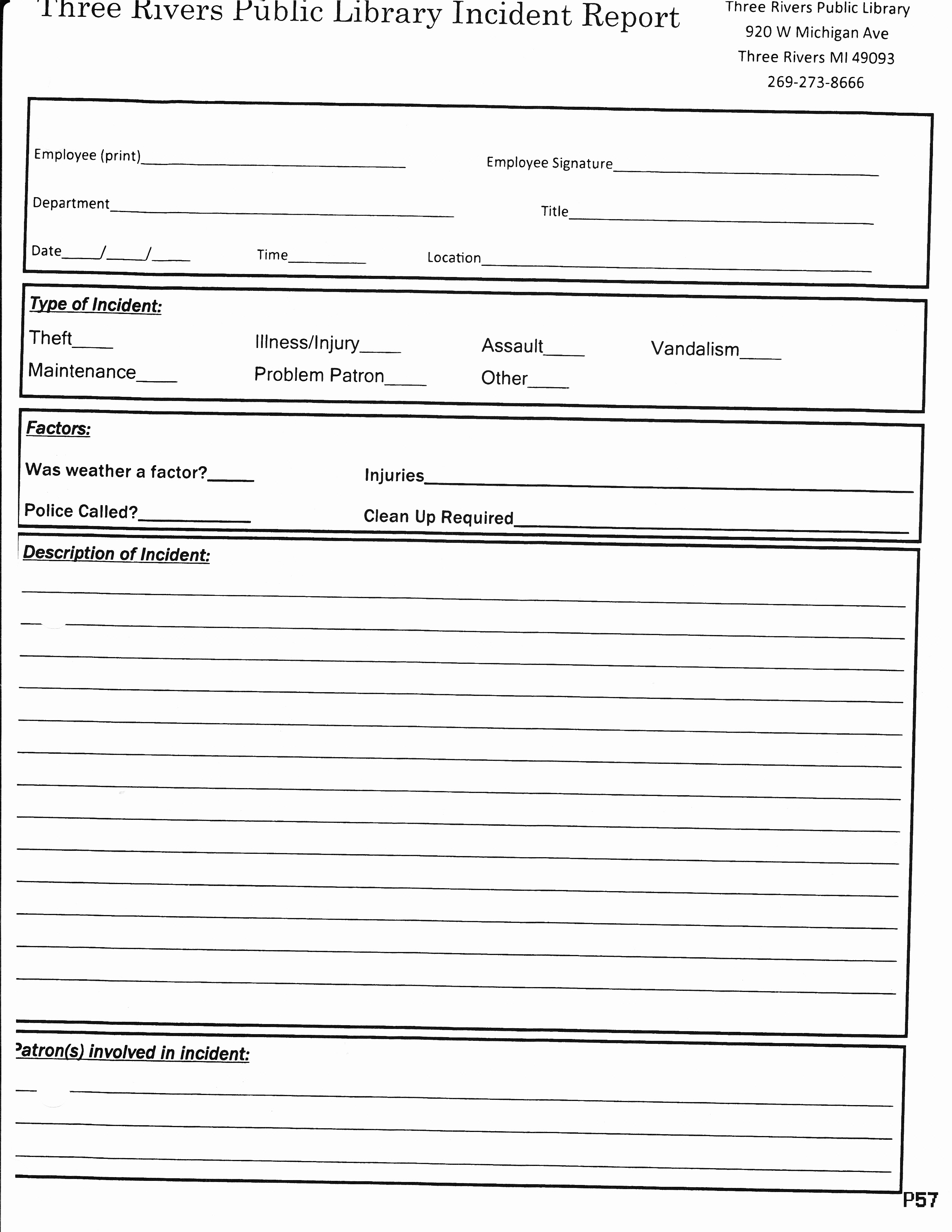 Jill, this is the incident report form utilized by Three Rivers Public Library. It was just updated and approved by our Board this past week. Sarah EmbilTRPL Board Presidentembilmama@hotmail.com Date: Fri, 30 Oct 2015 18:14:11 -0400 From: deckervillelibrary@gmail.com To: michlib-l@mcls.org Subject: [Michlib-l] Incident Report Greetings! Do you have an incident report form that you'd be willing to share? (I'd rather not re-invent the wheel.) Thanks for your help. Jill Brown, MLISLibrary DirectorDeckerville Public Library (zv089) (810) 376-8015"My two favorite things in life are libraries and bicycles. They both move people forward without wasting anything. The perfect day: riding a bike to the library." --Peter Golkin _______________________________________________ Michlib-l mailing list Michlib-l@mcls.org http://mail2.mcls.org/mailman/listinfo/michlib-l