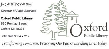 Today's my last day at Oxford Public Library! It's been an incredible 3 and a half years of sharing the joys of reading and programming with my amazing colleagues and community! I have loved your energy and creativity through joyous and difficult times and will miss you all especially in the steadfast ways you support each other as colleagues! Wishing you the best in all your future endeavors in Library Land. Jaema [cid:image003.jpg@01DC0DD8.ED5EEAF0] Currently reading: Vera Wong's Unsolicited Advice to Murders by Jesse Q. Sutanto And The German Wife by Kelly Rimmer