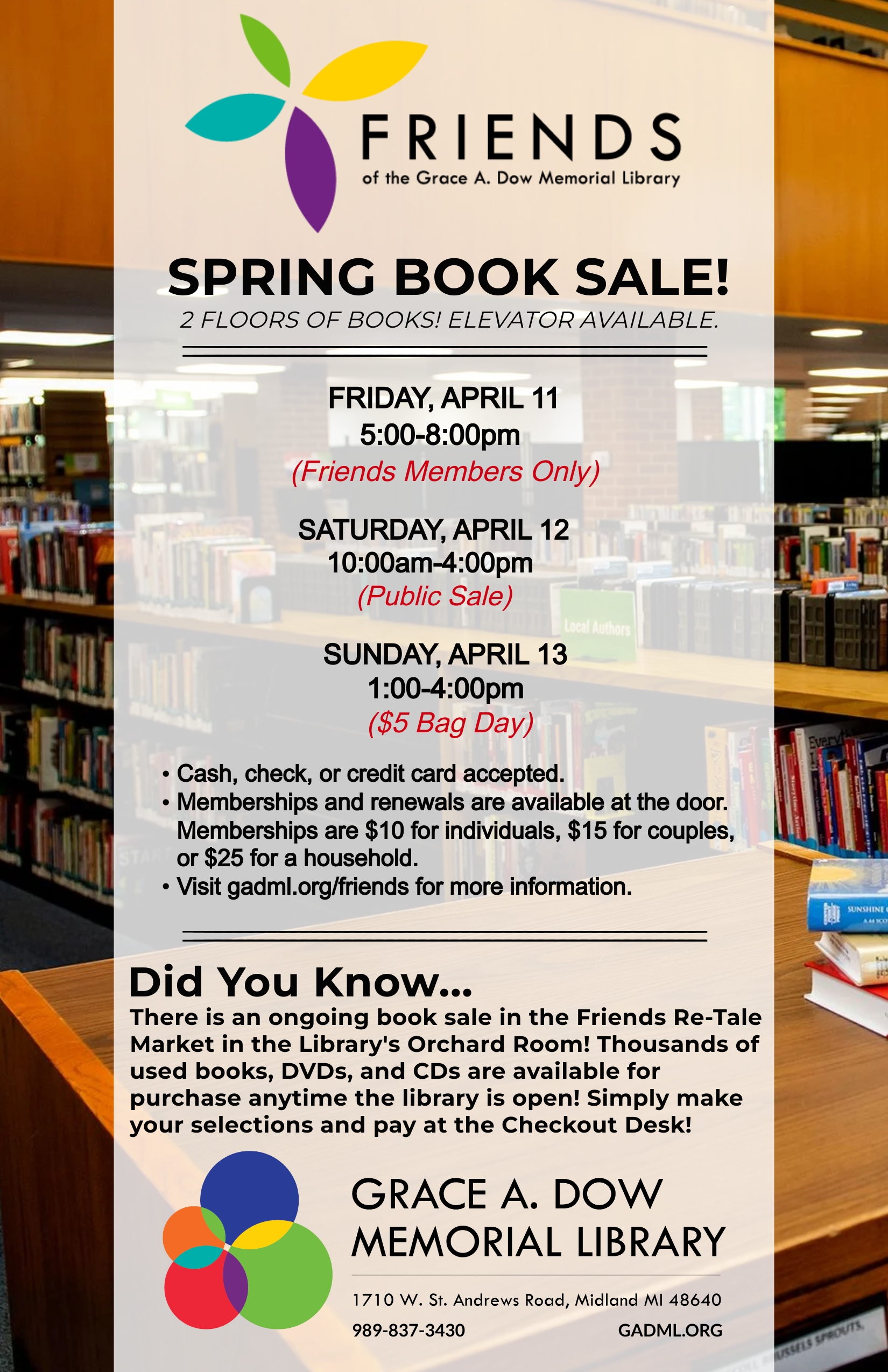 Hello Library Land- Spring here and it's a great time for a book sale! Grace A. Dow Memorial Library's Friends Book Sale is this weekend! +25,000 books Friday, April 11th 5pm - 8pm (Friends members only - memberships can be purchase at the door $10 and individual) Saturday, April 12th 10am - 4pm Sunday, April 13th 1pm - 4pm ($5.00 bag day- bag provided) Cash, Check, or Credit Card Accepted! General prices are $2.00 for a hardcover and $1.00 for a paperback. Specialty items have prices marked. __See you this weekend at the Grace A. Dow Memorial Library! [cid:image001.png@01DBA891.3BBC44C0] Miriam Andrus, MLS Director, Grace A. Dow Memorial Library 1710 W. St. Andrews Road, Midland, MI 48640 989-837-3431 direct www.gadml.org<http://www.gadml.org/> [cid:image002.png@01DBA891.3BBC44C0]<http://www.facebook.com/gracedowlibrary>[cid:image003.png@01DBA891.3BBC44C0]<http://www.twitter.com/cityofmidlandmi>[cid:image004.png@01DBA891.3BBC44C0]<http://www.instagram.com/gracedowlibrary>[cid:image005.png@01DBA891.3BBC44C0]<http://www.youtube.com/citymidland>