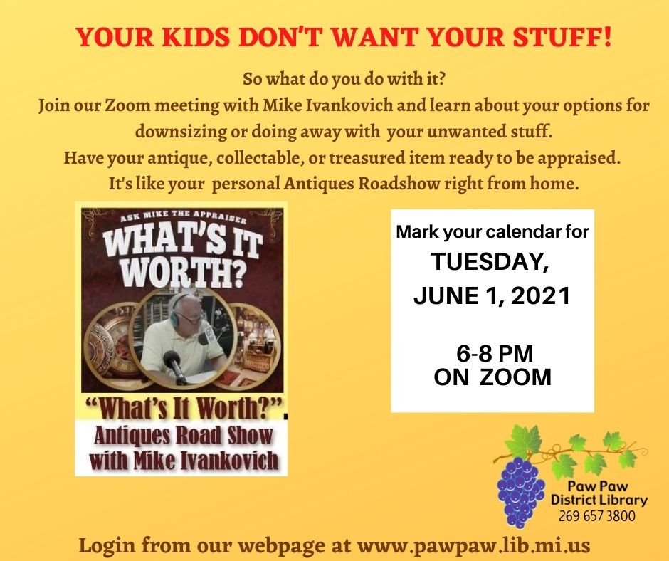 Paw Paw District Library welcomes to a Zoom meeting on Tuesday, June 1 from 6-8pm, Mike Ivankovich, an appraiser,auctioneer, home downsizing expert, and the radio show host of WBCB1490's What'sIt Worth? Ask Mike the Appraiser, Mike will introduce you to the factorsthat determine an item's true value. After a short presentation, he will revealwhat your antiques, collectibles, and personal treasures are worth today. The first 25attendees is invited to bring one or two items for Mike to appraise live onZoom! Find the link to the Zoom meeting on our website at: www.pawpaw.lib.mi.us Donna DlugeProgram ManagerPaw Paw District LibraryPaw Paw, MI 49079269 657-3800