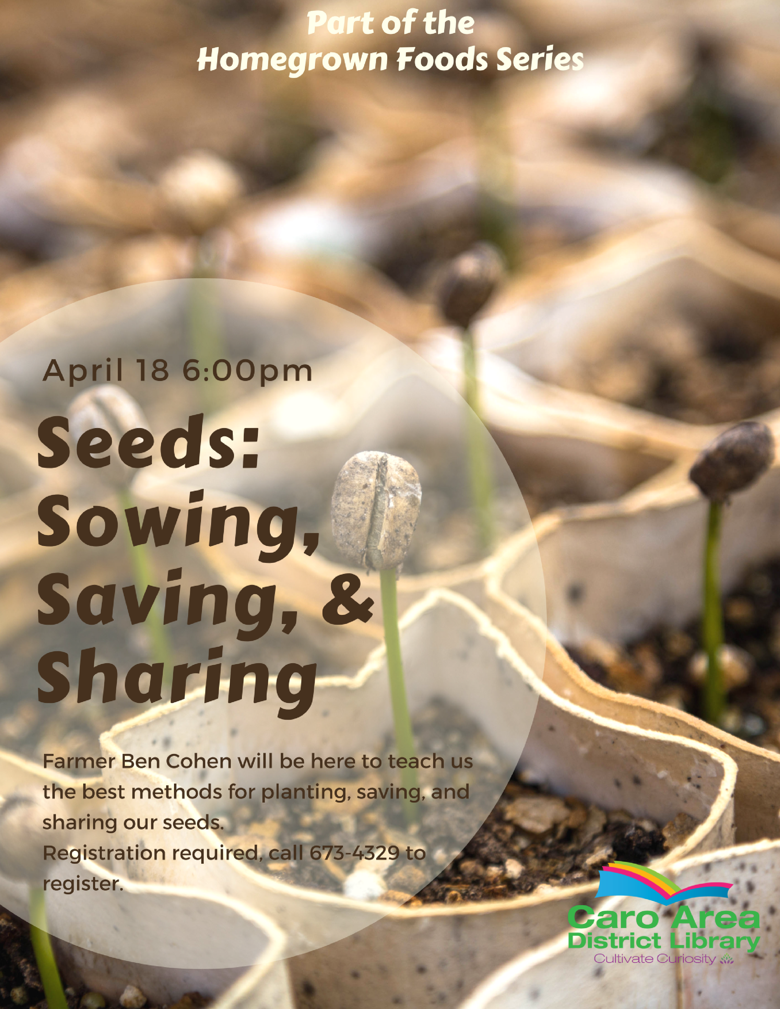Good Afternoon, I know many of you have started seed libraries over the last few years. We are going into year 7. On April 18th at 6pm we are having Farmer Ben Cohen here at the Caro Area District Library to speak about Seeds (sowing, saving, and sharing). He is a phenomenal speaker and I invite you all! If you do plan on coming I would appreciate an email off listserv just so I know how many to expect. Thanks, Melissa Armstrong Assistant Director Caro Area District Library 840 W Frank Street Caro, Michigan 48723 989-673-4329 ext. 107 melissa@carolibrary.org