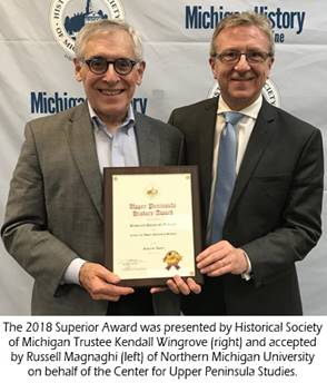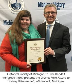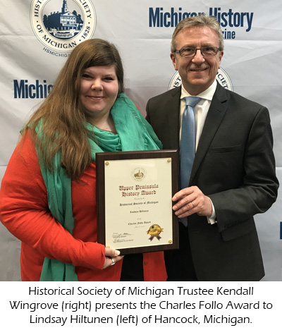 For more information about the Historical Society of Michigan and its award programs and conferences, visit <http://www.hsmichigan.org/> hsmichigan.org or call (517) 324-1828. THE 2018 CHARLES FOLLO AWARD The Charles Follo Award was established in 1979 and is named in honor of Charles Follo, a school teacher from Escanaba who worked to establish historical societies and promote the history of the Upper Peninsula. This award is presented annually by the Historical Society of Michigan to the individual who has made the most outstanding contribution to the preservation and promotion of Upper Peninsula history. This year, the Society awarded the Charles Follo Award to Lindsay Hiltunen of Hancock, Michigan. Hiltunen transformed the Michigan Technological University Archives and enhanced the access, research, and outreach programs. As the university archivist, she introduced the university's archival collections to K-12 students with school programs and activities, spearheaded projects focusing on underrepresented aspects of Upper Peninsula history, and worked with newsrooms to introduce Upper Peninsula topics into stories and news features throughout the state. THE 2018 SUPERIOR AWARD Established by the Historical Society of Michigan in 2006, the Superior Award recognizes historical societies, museums and other historical organizations that preserve and advance Upper Peninsula history. The 2018 Superior Award recipient was the Center for Upper Peninsula Studies (CUPS) in Marquette. Since its founding in 1994, CUPS has provided public and scholarly attention to the distinctive, rich culture of Michigan's Upper Peninsula through the collection and transcription of oral histories, hosting the annual Sonderegger Symposium, the publication of "Upper Country: A Journal of the Lake Superior Region," and serving as a press for monographs specific to the Upper Peninsula. The Historical Society of Michigan, publisher of Michigan History and Chronicle magazines, is the state's oldest cultural organization, founded in 1828 by territorial governor Lewis Cass and explorer Henry Schoolcraft. A nongovernmental nonprofit, the Society focuses on publications, conferences, education, awards and recognition programming, and support for local history organizations to preserve and promote Michigan's rich history. # # # Editor's Note: For high-resolution photos of the winners, please contact the Historical Society of Michigan at <mailto:hsm@hsmichigan.org> hsm@hsmichigan.org. This e-mail is sent to our members and friends to keep you updated on historical activities and opportunities to learn more about our state's history. To opt-out, please respond to this e-mail with "remove" in the subject line. If you received this e-mail as part of your participation in the Michlib-l mailing list (listserv), please follow their removal process.