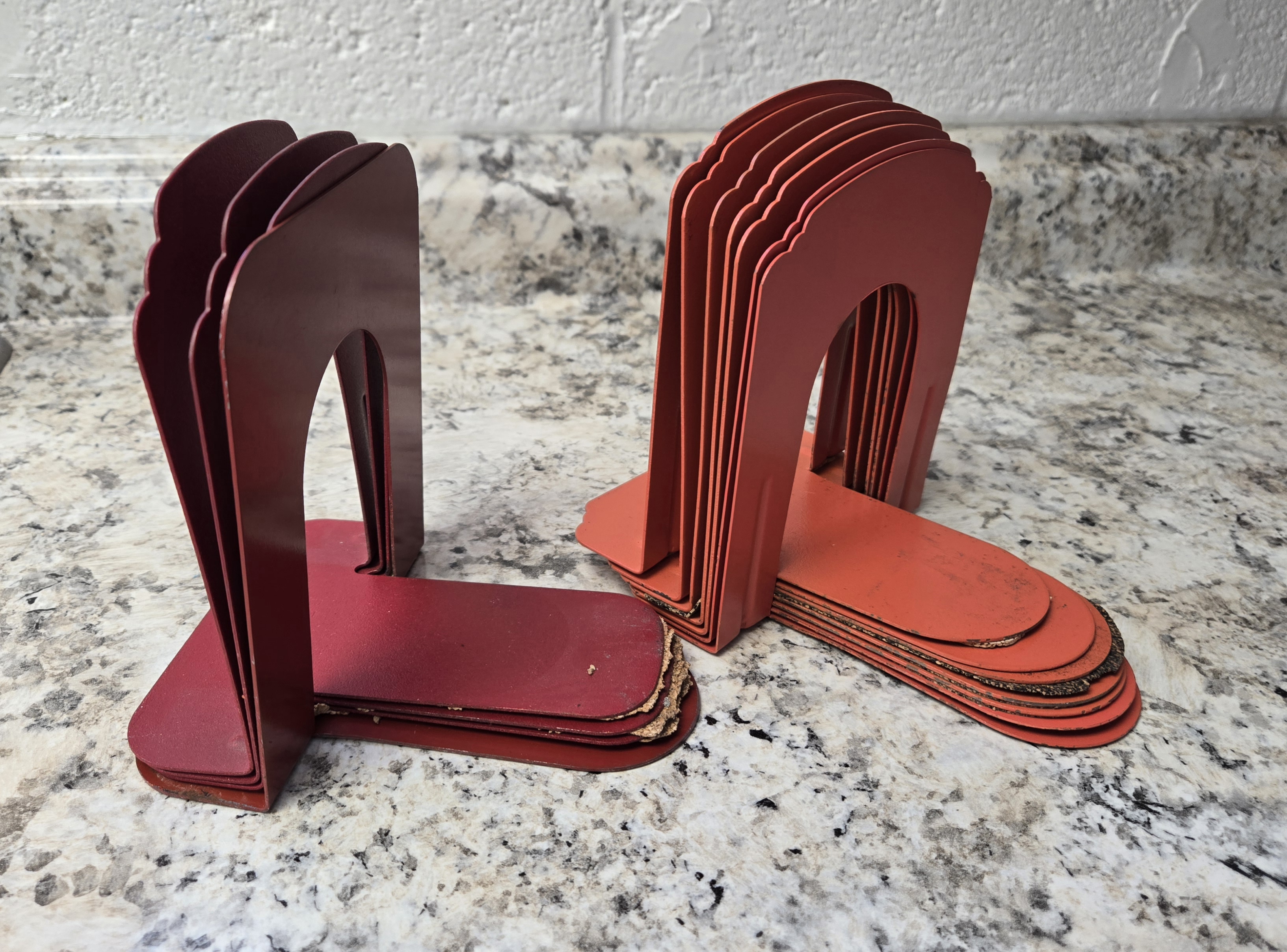 We have a number of short bookends that need a new home. Mostly red and orange. Some of the cork bases are a little worn.