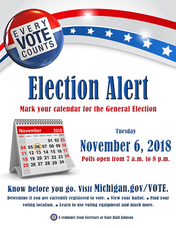 Hello, again! We're once again hoping our great libraries can help spread the word about the General Election on November 6. This is a statewide election, so we are asking all libraries to post the attached flyer and share the following message via your communication channels. On Monday, November 5, we will send you a social media message that we hope you will share as a final reminder to vote. As always, thank you for your help! Election Alert November 6 General Election Secretary of State Ruth Johnson is once again encouraging all eligible voters in Michigan to cast their ballots in the General Election on Tuesday, November 6. Polls are open on Election Day from 7 a.m. to 8 p.m. This year's ballot is a long one, so voters are encouraged to view it ahead of time by visiting www.michigan.gov/vote<http://www.michigan.gov/vote>. Know before you go! Twitter: #Election<https://twitter.com/search?q=%23Election&src=hash> Day in MI is Nov 6. Save time at the polls. Find your voting location and view your ballot ahead of time at mi.gov/vote<http://www.michigan.gov/vote>. @MichSOS With much gratitude, Cathleen Simlar Cathleen P. Simlar Communications Specialist, Executive Office Michigan Department of State Office: (517) 373-9080 Cell: (248) 761-7145 Email: Simlarc@michigan.gov<mailto:Simlarc@michigan.gov> Join My Professional network on LinkedIn<blocked::http://www.linkedin.com/pub/cathleen-simlar/18/798/235> [Description: Description: Description: SOS logo small] <http://www.michigan.gov/sos> STAY CONNECTED: [Description: Description: Description: Facebook logo]<http://www.facebook.com/MichiganSoS> [Description: Description: Description: Twitter logo] <https://twitter.com/michsos> [Description: Description: Description: YouTube logo] <http://www.youtube.com/michsosoffice> [Description: Description: Description: GovDelivery logo] <https://public.govdelivery.com/accounts/MISOS/subscriber/new>