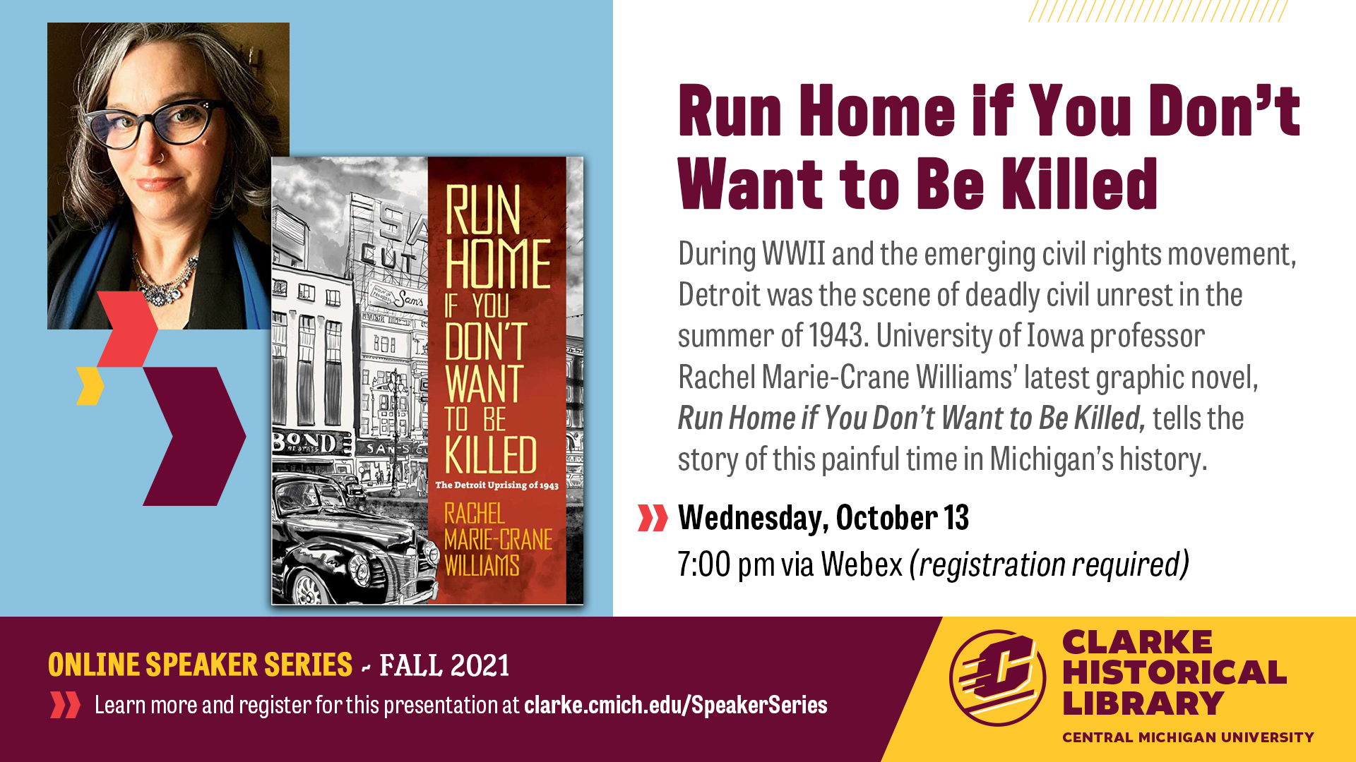 On Wednesday, October 13, at 7:00 pm EDT, the Clarke Historical Library at Central Michigan University will host the first of four presentations as part of the Clarke's Virtual Fall Speakers Series (you can find the entire line-up on the Clarke's website<https://www.cmich.edu/library/clarke/publicprograms/current_exhibit/pages/default.aspx#speakers>). Rachel Marie-Crane Williams will speak about her latest graphic novel, Run Home if You Don't Want to Be Killed. In the context of WWII and the emerging civil rights movement, Detroit was the scene of deadly civil unrest in the summer of 1943. Professor Williams' book tells the story of this painful time in Michigan's history. She will join the Clarke to share her research and artistry in developing this book. This presentation is free and open to the public. The event will be broadcast via Central Michigan University's videoconferencing tool, Webex, and it will be recorded to enjoy at a later time. Registration is required for the event and the shortened link to register is: https://is.gd/ClarkeWilliams. Please share this information with anyone who you think might be interested. The Clarke is happy to answer any questions that anyone may have-please contact Bryan Whitledge (whitl1br@cmich.edu<mailto:whitl1br@cmich.edu>). Have a great day, Bryan Whitledge Archivist for University Digital Records Clarke Historical Library Central Michigan University 989-774-2159 whitl1br@cmich.edu<mailto:whitl1br@cmich.edu>