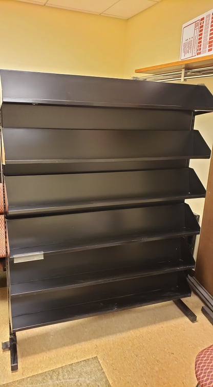 We have a shelving unit available. Unfortunately, we do not have any good pictures of it while it was fully assembled. It measures 8' wide by 5'3" tall. The unit is double sided. The picture only shows half of the unit, it can be assembled with half the unit or the full unit, but not two separate units. It also has two end caps not pictured. If you are interested, I can try to get some more pictures of it. You must pick it up yourself. Jessica Hunt, Director Grant Area District Library 122 South Elder Avenue Grant, MI 49327 (231) 834-5713