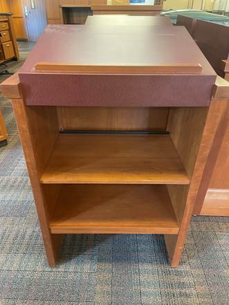 We have three dictionary stands that need new homes. They measure 43 ¾" tall and 28 ½"wide. The two bottom shelves are 19 ¾" deep and the top is slanted for display. Pick-up only at Kalamazoo College Library in Kalamazoo, MI. [cid:image001.jpg@01D9C917.6361E0D0] Hillary Berry (she/her) Library Circulation Supervisor Kalamazoo College Library 269.337.5731 Library.kzoo.edu<library.kzoo.edu>