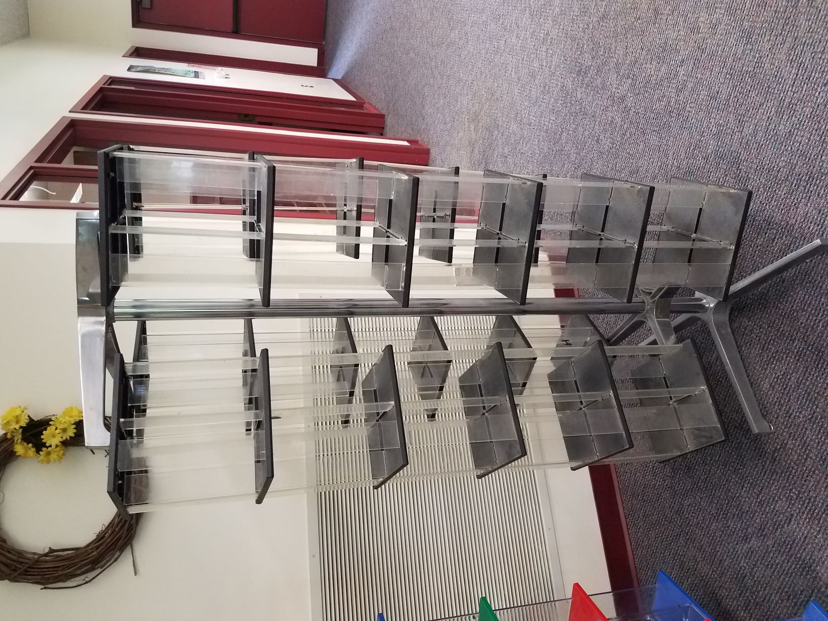 I have two of the book spinners with colored tops (5 spindles each, 4 levels per spindle) that we had our DVDs in. I have 1 of the black top (4 spindles, 5 levels) that held DVDs. $20 each. Pickup only at the Bridgeport Public Library. Both are under 5 feet tall See attached photos. Amber L Hughey, MLIS Director Bridgeport Public Library