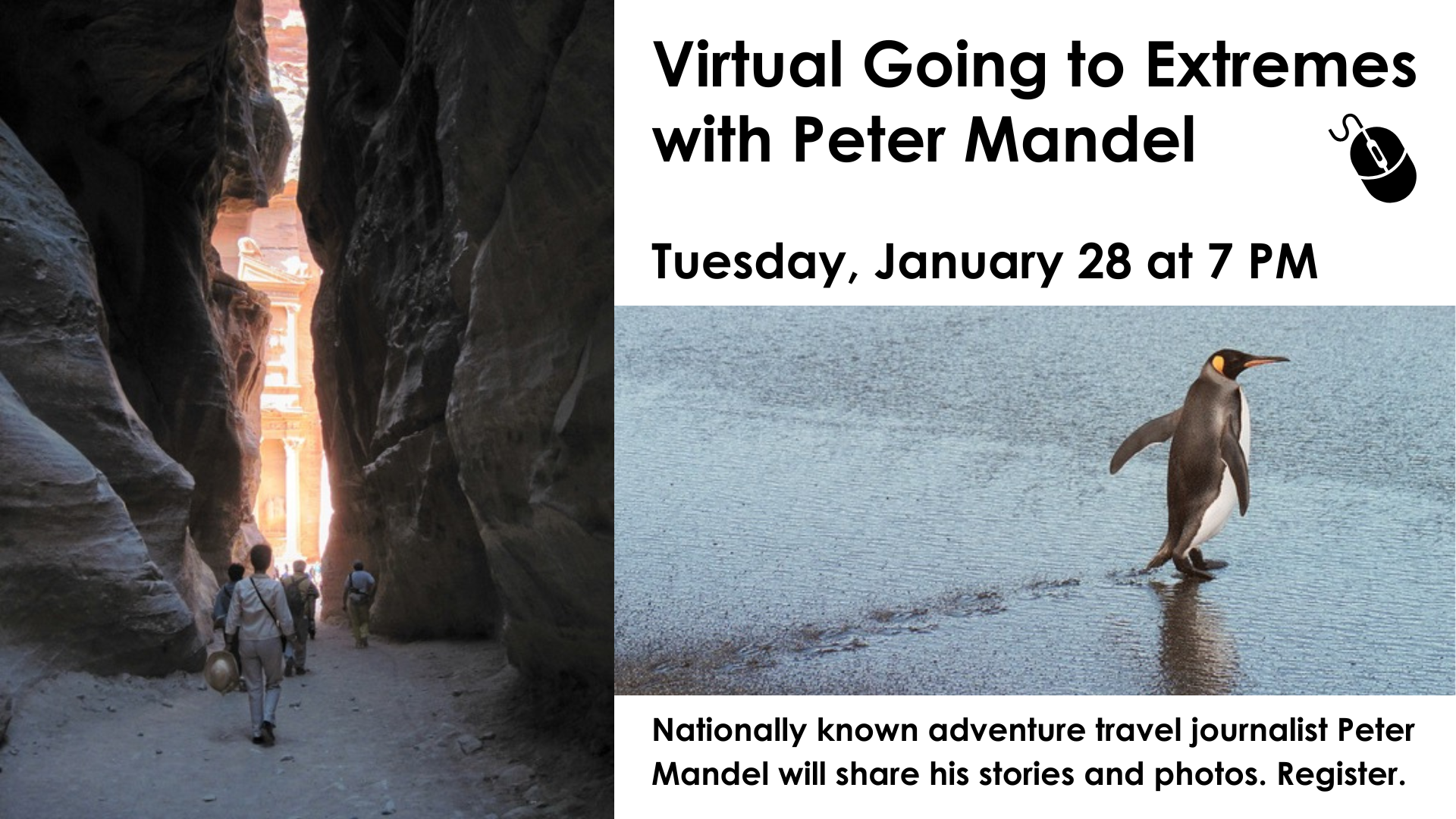 Join us tomorrow via Zoom at 7 PM to hear from adventure travel journalist & author, Peter Mandel