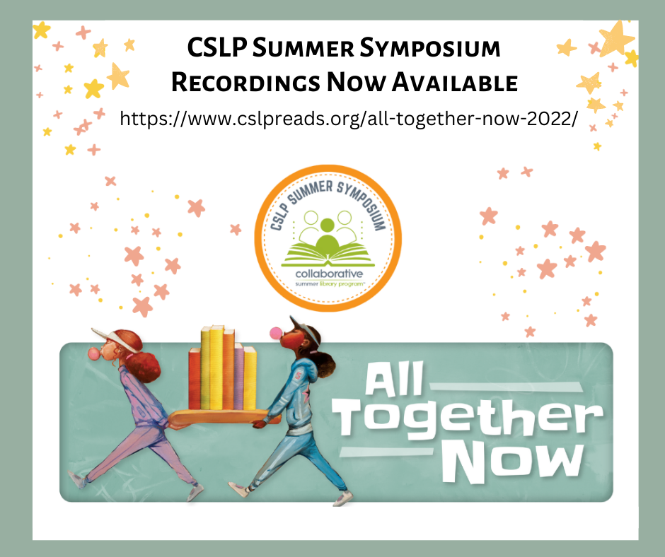[cid:image001.png@01D91451.B0E58A80] The recordings from the Collaborative Summer Library Program's "All Together Now!" Summer Symposium are now available, including the powerful keynote address from ALA Executive Director, Tracie D. Hall. Along with the recordings are links to the handouts, slides, and chatbox information. Please go to the CSLP Summer Symposium website for detials: https://www.cslpreads.org/all-together-now-2022/. There is also a symposium survey<https://www.cslpreads.org/wp-content/uploads/2022/12/8-CSLP-Summer-Symposium-Survey-Link-and-webinar-survey-link.pdf>, open through January 6, 2023, and an education unit certificate available for printing, for reporting continuing ed hours. CSLP empowers libraries to foster community by creating an inclusive literacy based program that is enjoyable for all ages, and by providing a reproduicible program with a unified theme, sharing resources and offering professional support. Cathy Lancaster CSLP<https://www.cslpreads.org/> President-Elect, Youth Services Coordinator Library of Michigan 702 W. Kalamazoo St. Lansing, MI 48915 My Pronouns: She/Her/Hers - See www.mypronouns.org<http://www.mypronouns.org/> to learn more. LancasterC5@michigan.gov<mailto:LancasterC5@michigan.gov> | 517-335-8129 | www.mi.gov/libraryofmichigan<http://www.mi.gov/libraryofmichigan> Follow us: Facebook<https://www.facebook.com/libraryofmichigan/> | Twitter<https://twitter.com/libraryofmich> | Instagram<https://www.instagram.com/libraryofmichigan/>