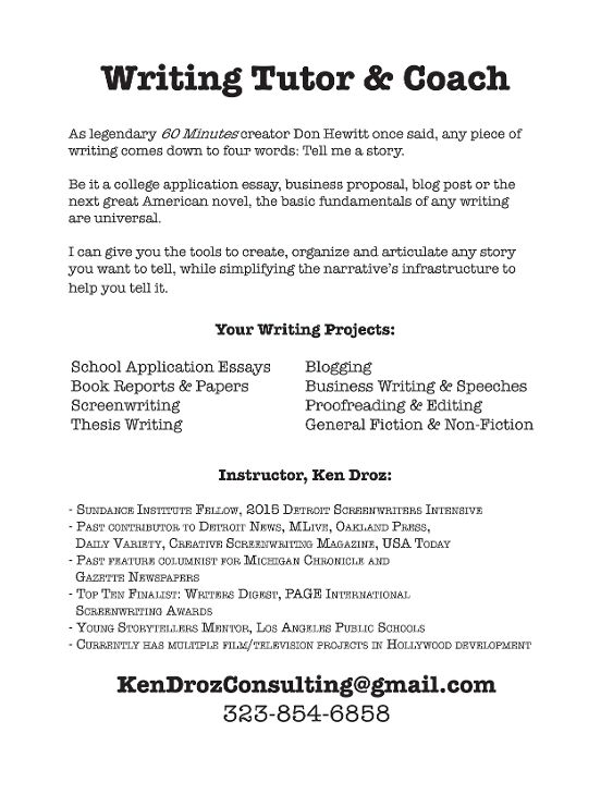 Ken Droz is a personal friend, talented screenwriter and engaging storyteller. He is available for fun and engaging writing workshops at your library. He is also available for individual tutoring and coaching. Here's his professional credentials and how to find him! Francine Menken,MLIS Director / Henry & Delia Meyers Library and Media Center Jewish Community Center of Metropolitan Detroit 6600 W. Maple Road West Bloomfield, MI 48322 phone: 248.432.5546 fax: 248.432.5540 fmenken@jccdet.org mailto:fmenken@jccdet.org