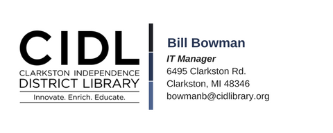 Forgot to add the text of the description into the email body. Here we go again! Full-time Youth and Teen Services Librarian Hours: 40 hours per week, includes some weekends and evenings Salary: $37,000 to $48,000 depending on qualifications and experience Benefits: Health, dental, optical insurance; disability and life insurance; vacation, sick and personal days; retirement plan. Primary Duties and Responsibilities * Working as part of the Youth Services Team, develop collections for teens * Under the direction of the Department Head, collaborate with community organizations to promote library services * Coordinate with the Youth Services Team to design a variety of activities that promote the use of the library by tweens and teens allowing for a continuum of library use across the age span. * Maintain and cultivate relationships with the public schools, private schools and local teachers * Work with Head of Children's and Teens services to update the Teen Services portion of the website * Provide library outreach services to the local public and private schools * Assist with Youth Services Department programs for younger patrons as needed * Assist patrons of all ages in obtaining information in a variety of formats * Provide readers' advisory services to patrons of all ages * Instruct patrons individually and in small groups in the use of library resources and equipment Required Qualifications * MLIS from an ALA accredited institution * At least one year of experience working with teens and enthusiastic commitment to teen services * Desire and ability to provide excellent customer service inside and outside of the library * Strong organizational and planning skills with the ability to work independently or as a team leader * Public library/information desk experience * Experience working with ILS, Polaris preferred * Collection development experience * Knowledge of popular print and audio-visual materials for teens Reports to: Head of Children's and Teen Services To apply please send resume, cover letter and three professional references to: Tracy Bedford Head of Children's and Teen Services bedfordt@cidlibrary.org Deadline to apply is Tuesday May 1, 2018 [Bill_2] From: Bill Bowman Sent: Tuesday, April 17, 2018 10:38 AM To: michlib-l@mcls.org Subject: Full Time Youth & Teen Librarian Position @ CIDL The Clarkston Independence District Library is looking for a librarian! Are you passionate about youth and teen services? Do you like being part of a collaborative team? We are searching for someone who will take over some of our already established, awesome teen programming, someone who is excited about creating new and innovative programs for teens and tweens, and someone who enjoys working with children of all ages. If this sounds like you, take a look at our job description! [Bill_2]