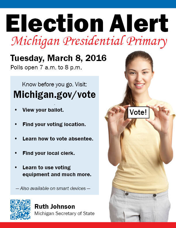 Please help us remind the public that tomorrow is Election Day in many communities by sharing the following social media messages. * Twitter: Tomorrow is #Election<https://twitter.com/search?q=%23Election&src=hash> Day in many communities in MI. Find out if your hometowns is having an election and view your ballot at mi.gov/vote<http://www.michigan.gov/vote>. * Facebook: Have your voice heard! Tuesday, March 8 is #Election Day in Michigan! Visit Michigan.gov/vote<http://www.michigan.gov/vote> to view your ballot and find your voting location. Cathleen Simlar Cathleen P. Simlar Communications Specialist, Executive Office Michigan Department of State Office: (517) 373-9080 Cell: (248) 761-7145 Email: Simlarc@michigan.gov<mailto:Simlarc@michigan.gov> Join My Professional network on LinkedIn<blocked::http://www.linkedin.com/pub/cathleen-simlar/18/798/235> [Description: Description: Description: SOS logo small] <http://www.michigan.gov/sos> STAY CONNECTED: [Description: Description: Description: Facebook logo]<http://www.facebook.com/MichiganSoS> [Description: Description: Description: Twitter logo] <https://twitter.com/michsos> [Description: Description: Description: YouTube logo] <http://www.youtube.com/michsosoffice> [Description: Description: Description: GovDelivery logo] <https://public.govdelivery.com/accounts/MISOS/subscriber/new>