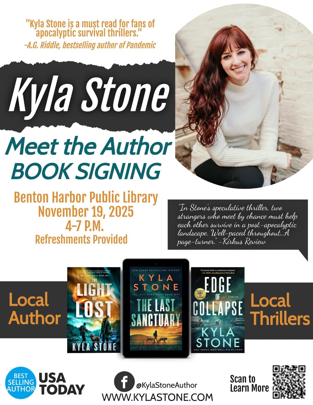 Please mark your calendars for Wednesday, November 9, when bestselling author Kyla Stone will be at the Benton Harbor Public Library to sign and talk about her books. She'll be at the library from 4 to 7 p.m. for this informal, drop-in event. She is a Michigan native, and is known for her post-apocalypic thrillers set here. I hope you'll share this with your patrons! Jill Rauh, Public Services Librarian Benton Harbor Public Library 213 E. Wall St. Benton Harbor, MI 49022 269-926-6139 www.bentonharborlibrary.com The information and views presented do not necessarily represent those of the Benton Harbor Public Library.