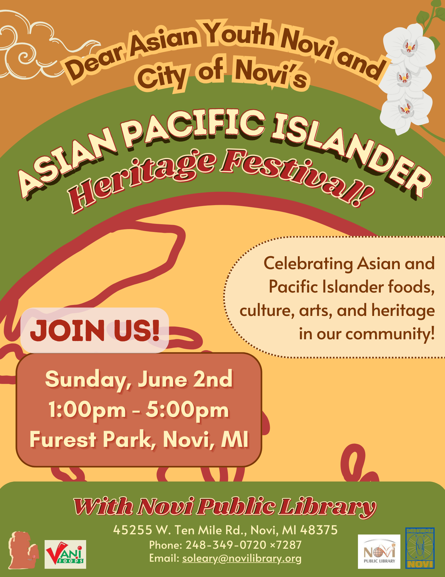 Hi Everyone! We have a fantastic program coming soon at Novi Public Library. In conjunction with a high school organization called Dear Asian Youth Novi (DAYN), Novi Public Library will be hosting our second annual Asian Pacific Islander Heritage Program on Sunday, June 2nd from 1-5pm. Located at Fuerst Park (behind the library), the event will feature food (for purchase), face painting, henna, performances and more! The event is free of charge, so please take advantage of this wonderful opportunity. I am attaching our flyer for the event, but please don't hesitate to reach out if you have any questions! We hope to see you there! Shannon O'Leary *Shannon O'Leary *| International Librarian (she/her/hers) Novi Public Library 45255 W. Ten Mile Rd. Novi MI 48375 *Office: * 248-349-0720 Ext: 7287 www.novilibrary.org Currently Reading <https://www.goodreads.com/user/email_signature_destination/29172487?utm_medium=reading_link&utm_source=email_signature> [image: Book Cover] <https://www.goodreads.com/user/email_signature_destination/29172487?utm_medium=cover&utm_source=email_signature> [image: Goodreads Logo] <https://www.goodreads.com/?utm_medium=gr_logo&utm_source=email_signature>Get your own email signature <https://www.goodreads.com/user/email_signature_instructions?utm_medium=gyo_link&utm_source=email_signature> *Inform. Inspire. Include.* <https://mysignature.io/editor?utm_source=promotion&utm_medium=signature&utm_campaign=create_own_signature>
