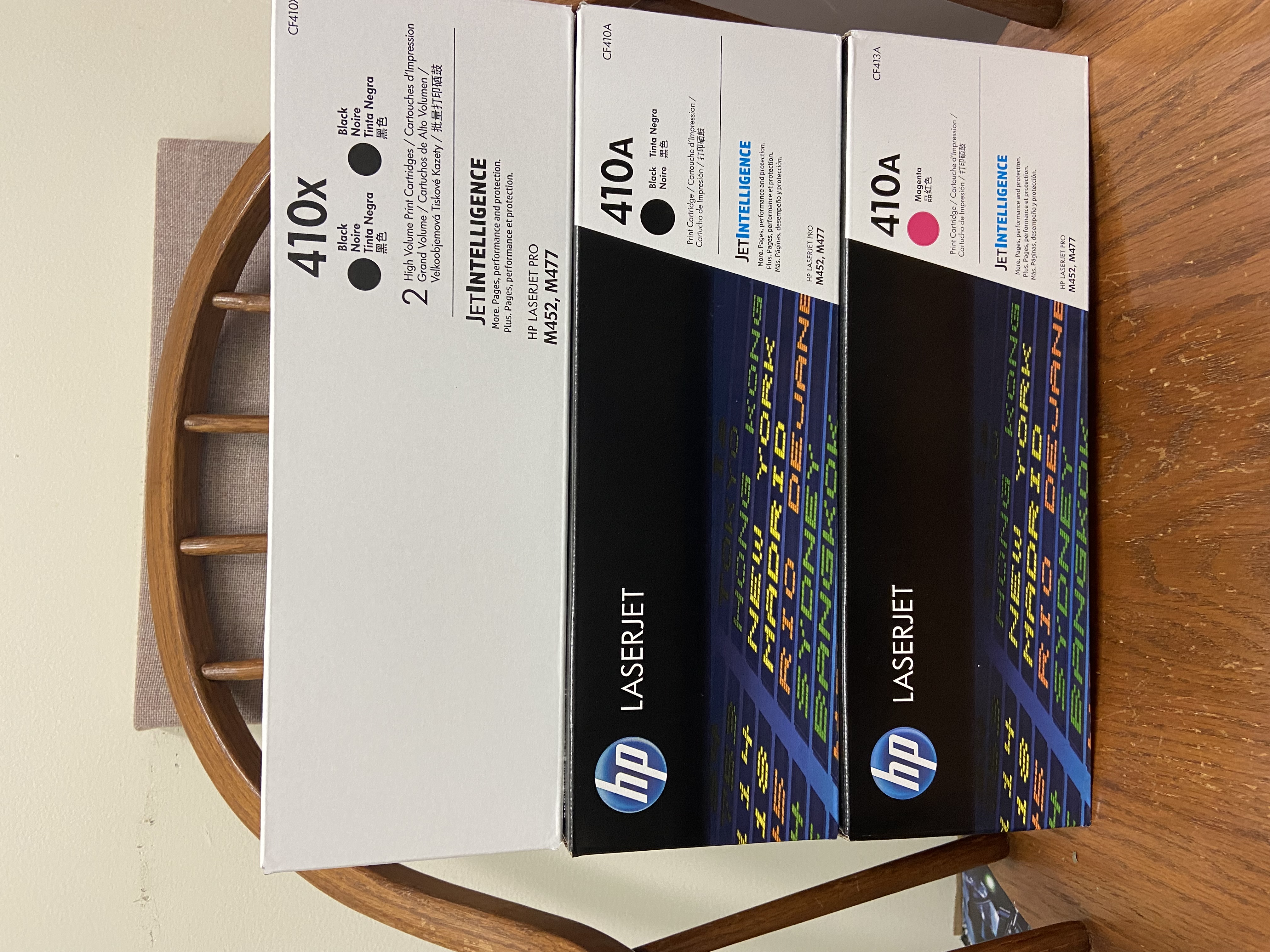 We have 3 toner cartridges that we can no longer use. HP CF410XD HP CF410A HP CF413A If you have a printer that could use them, please send me your RIDES code. *Julie Burch* *Administrative Assistant* *Sturgis District Librar*