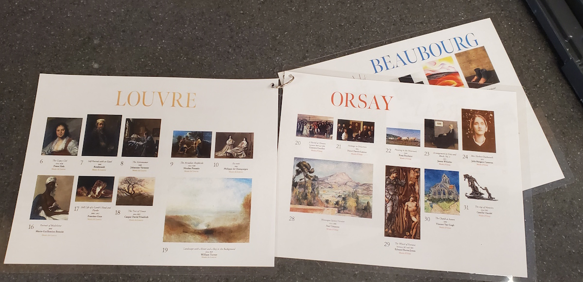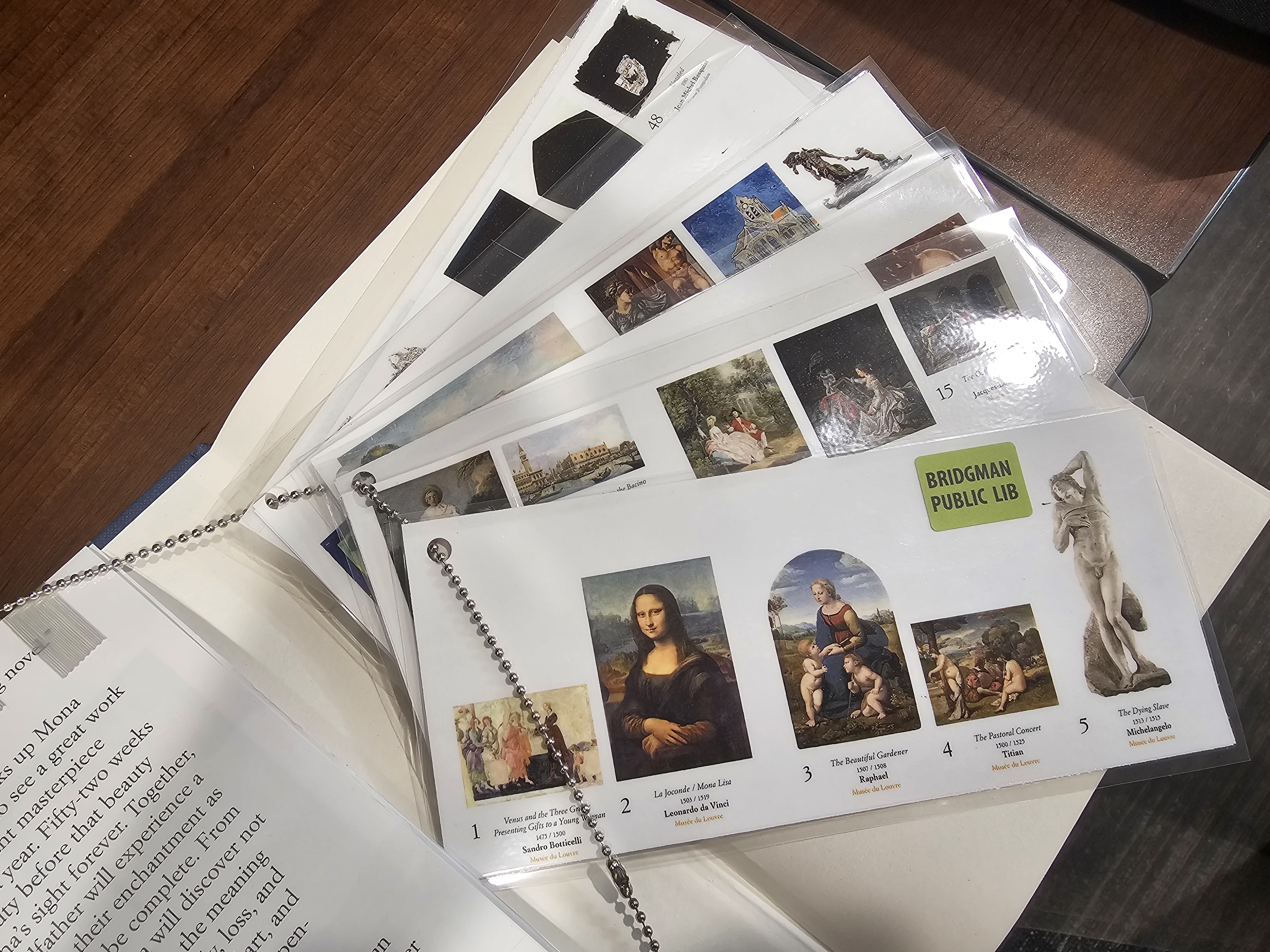 Hi everyone, happy Tuesday! I hope you all will forgive my resurrection of this email chain, but we dealt with this book ourselves this week and I wanted to share our solution in case it might be of use to anyone else. Our excellent librarian in charge of adult fiction brainstormed this idea and I was able to put it into action with some tinkering! I scanned the inside of the jacket in portions, did some editing, and printed out sets of 3 double-sided pages which I laminated and clipped together with a book ring. These sets are kept near the checkout desk so we don't have to worry about keeping them on the shelf with the books. I then put a digital note on the item record for each book in our ILS which will pop up upon checkout, prompting staff to ask the patron whether they would like the supplemental material for the book. I have included an image of the finished product, along with a PDF of my edited pages so anyone who wants to do the same can easily replicate this! I'm happy to answer any more questions you might have about the process. [https://res.public.onecdn.static.microsoft/assets/fluentui-resources/1.1.0/app-min/assets/item-types/24/pdf.png]mona's eyes.pdf<https://ssldl-my.sharepoint.com/:b:/g/personal/mmahoney_ssldl_info/IQAEioVjQRLdSomJZLKzRCeoAbMIhqNgDqpeXWTlHmOwSt8> Molly Mahoney (she/he) Technical Services Supervisor Salem-South Lyon District Library SLYN_97 ________________________________ From: Cindy Persic via Michlib-l <michlib-l@liblists.org> Sent: Monday, February 2, 2026 12:37 PM To: michlib-l@liblists.org <michlib-l@liblists.org> Subject: [Michlib-l] Mona's Eyes Hello, friends! I just purchased Mona's Eyes and it is the Europa version which has a double-sided cover that unfolds to twice it's size. Normally I would just cover it like a normal book but the cover has images of all the paintings that are referenced in the book and I feel it's important to have them included. We talked about reducing and laminating the images to include as inserts but aren't sure how well that will work. Has anyone done anything similar or have another idea? Thanks! Cindy Cindy Persic Cataloging/Collections "Be kinder than necessary, for everyone you meet is fighting some kind of battle." [https://ci3.googleusercontent.com/mail-sig/AIorK4y1Xx_GKTNT48GOlJ2BZ7VhkMIQR...]