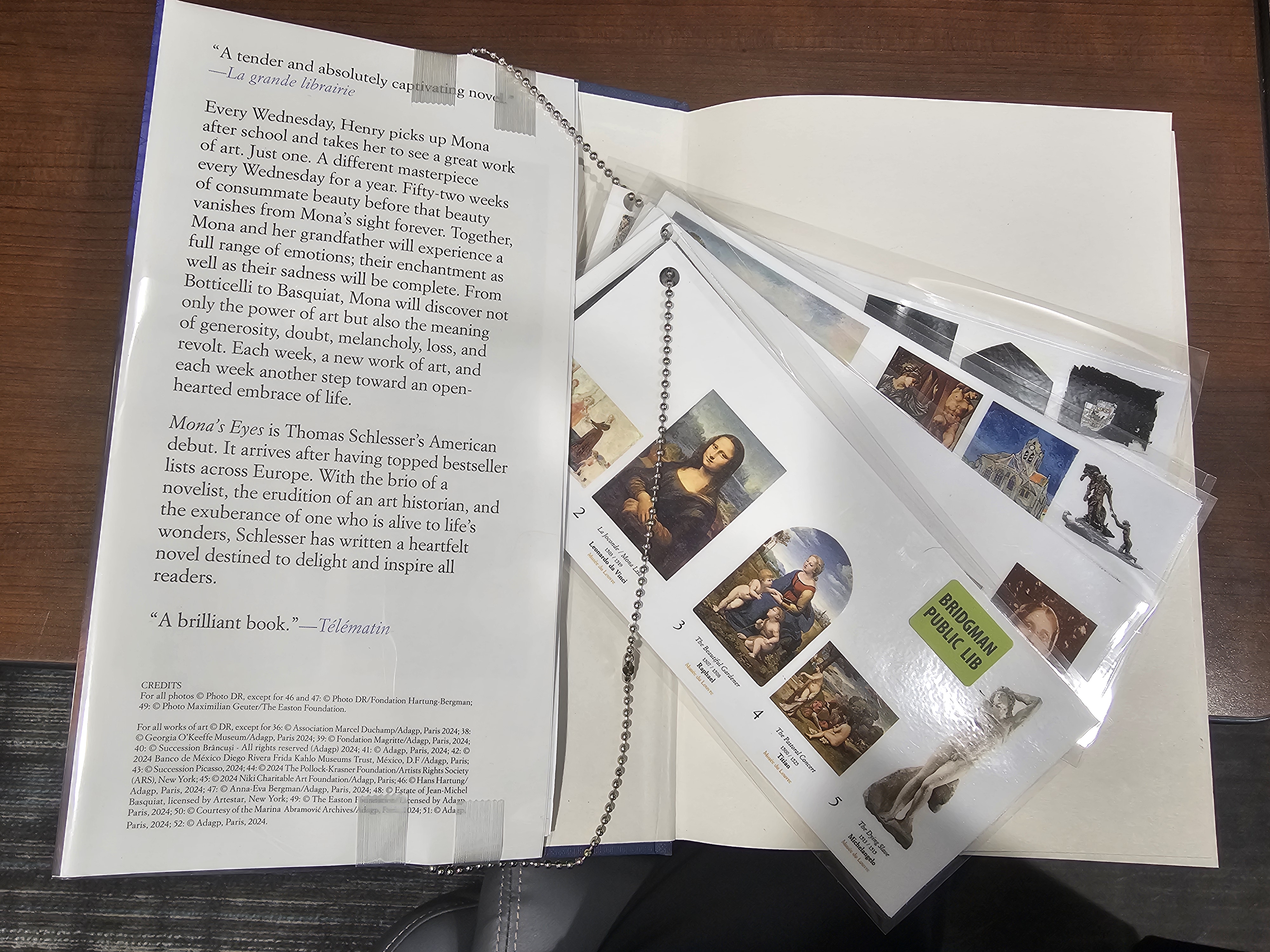 Thank you, Cindy! Lynne Wiercinski, Director Ironwood Carnegie Library 235 East Aurora Ironwood, MI 49938 906.932.4789 ________________________________ From: Cindy Persic <cindyp@bridgmanlibrary.com> Sent: Tuesday, February 10, 2026 9:17 AM To: Lynne Wiercinski <lynne@ironwoodcarnegie.org> Cc: michlib-l@liblists.org <michlib-l@liblists.org> Subject: Re: [Michlib-l] Mona's Eyes After several tries at copying, cutting, pasting, copying and then crying, I copied each row of pictures at 65%, cut the rows to the same size, used a glue stick to hold them back-to-back in numerical order and then laminated them. I tried several ways to hold them together and currently this chain allowed them to lay the flattest in the book. It's not perfect but I needed to get it out on the floor. Had the images not been so integral to the story, I would not have gone to the effort. I'm currently looking for a stick-on slip that I can put on one of the inside flaps to slide them into like a CD. I will update if I am able to improve the system. Thank you for all the suggestions! You library peeps are the best! Cindy Persic Cataloging/Collections "Be kinder than necessary, for everyone you meet is fighting some kind of battle." [https://ci3.googleusercontent.com/mail-sig/AIorK4y1Xx_GKTNT48GOlJ2BZ7VhkMIQR...] On Mon, Feb 9, 2026 at 1:31 PM Lynne Wiercinski <lynne@ironwoodcarnegie.org<mailto:lynne@ironwoodcarnegie.org>> wrote: Cindy...what did you decide to do? Lynne Wiercinski, Director Ironwood Carnegie Library 235 East Aurora Ironwood, MI 49938 906.932.4789 ________________________________ From: Cindy Persic via Michlib-l <michlib-l@liblists.org<mailto:michlib-l@liblists.org>> Sent: Monday, February 2, 2026 11:37 AM To: michlib-l@liblists.org<mailto:michlib-l@liblists.org> <michlib-l@liblists.org<mailto:michlib-l@liblists.org>> Subject: [Michlib-l] Mona's Eyes Hello, friends! I just purchased Mona's Eyes and it is the Europa version which has a double-sided cover that unfolds to twice it's size. Normally I would just cover it like a normal book but the cover has images of all the paintings that are referenced in the book and I feel it's important to have them included. We talked about reducing and laminating the images to include as inserts but aren't sure how well that will work. Has anyone done anything similar or have another idea? Thanks! Cindy Cindy Persic Cataloging/Collections "Be kinder than necessary, for everyone you meet is fighting some kind of battle." [https://ci3.googleusercontent.com/mail-sig/AIorK4y1Xx_GKTNT48GOlJ2BZ7VhkMIQR...]