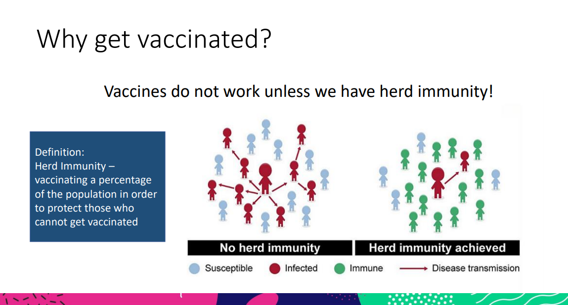 "In this talk, we will review the basics of COVID-19: what is it, how does it transmit, how does it make us sick, and what do I do if I am exposed to someone? We will review basic infection control practices, such as masking and social distancing, and why these work. We will also review the current vaccines on the market and how it helps to decrease community transmission."
