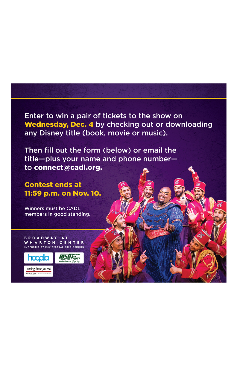 Website Earns Honor The CADL website has earned a Gold MarCom Award from the Association of Marketing and Communication Professionals. Congratulations to our web designer Addis Enterprises, IT Director Sheryl Knox and all the CADL staff who helped with the new website (www.cadl.org<http://www.cadl.org>). The MarCom is one of the oldest, largest and most prestigious creative competitions in the world, with industry professionals judging companies and individuals whose talent exceeds a high standard of excellence. https://www.amcpros.com/ Frozen Fridays People are lining up for a chance to attend our special screening of Disney's Frozen II. Loosely based on the "door buster" concept that the retail sector uses, four branches of CADL are hosting Free Frozen Fridays where 450 free tickets are given away to new and current library members for a limited time. Some branches have had people waiting up to three hours prior to the giveaway start time. CADL is also running a promotion with Disney for their Aladdin Musical (graphic is attached). Here's a great online article from Lansing Family Fun https://lansingfamilyfun.com/capital-area-district-libraries-cadl/?fbclid=Iw... Trenton M. Smiley Marketing & Communications Director Capital Area District Libraries-Administration 401 S. Capitol Ave., Lansing, MI 48933 517-367-6348 | smileyt@cadl.org<mailto:smileyt@cadl.org> www.cadl.org<https://urldefense.proofpoint.com/v2/url?u=http-3A__www.cadl.org&d=DQMFAg&c=euGZstcaTDllvimEN8b7jXrwqOf-v5A_CdpgnVfiiMM&r=eQ4zwfvICxqHRkdUL5_5Ew&m=10jJJ5KSdHz2-h8X5t1pHUHubNn2DWMq89Hf3-OPD2Y&s=3rbAsyBXjj2NNLBsgfvAFXBIOTtrw486OCi5yA3tUNc&e=> | facebook.com/cadlibrary<https://urldefense.proofpoint.com/v2/url?u=https-3A__www.facebook.com_cadlibrary-3Fref-3Dhl&d=DQMFAg&c=euGZstcaTDllvimEN8b7jXrwqOf-v5A_CdpgnVfiiMM&r=eQ4zwfvICxqHRkdUL5_5Ew&m=10jJJ5KSdHz2-h8X5t1pHUHubNn2DWMq89Hf3-OPD2Y&s=Mh_HT9zWTBaQYNJrkGn5UQkZsHahpNWPo3T1jUZsMTo&e=> | twitter.com/cadl<https://urldefense.proofpoint.com/v2/url?u=http-3A__www.twitter.com_cadl&d=DQMFAg&c=euGZstcaTDllvimEN8b7jXrwqOf-v5A_CdpgnVfiiMM&r=eQ4zwfvICxqHRkdUL5_5Ew&m=10jJJ5KSdHz2-h8X5t1pHUHubNn2DWMq89Hf3-OPD2Y&s=kjEu80TS31ymwngLwD5AH2BEd7u0lbjJEff7iRegUfQ&e=>