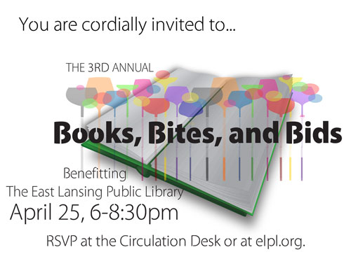 You're Invited! View this email in your browser ( http://us6.campaign-archive1.com/?u=35276309bb2ef0a7f72063026&id=679d2c2ede&e=4e8b0281ff ) You are cordially invited to the 3rd Annual Books, Bites and Bids Benefitting the East Lansing Public Library Friday, April 25, 6-8:30pm Books, Bites and Bids is a silent auction with live music, children's activities, heavy hors d'oeuvres, drinks and a short program at 6:45pm. View the current list of silent auction items on our website ( http://cityofeastlansing.us6.list-manage1.com/track/click?u=35276309bb2ef0a7f72063026&id=7701b001c3&e=4e8b0281ff ). A donation of $30 per person or $50 per couple/family is suggested. Proceeds from the fundraiser will go towards a digital maker lab at the library. Please RSVP at the Circulation Desk or online ( http://cityofeastlansing.us6.list-manage.com/track/click?u=35276309bb2ef0a7f72063026&id=ec7c6adfcf&e=4e8b0281ff ). Join us on April 25th to celebrate and support the East Lansing Public Library! Copyright © 2014 East Lansing Public Library, All rights reserved. Our mailing address is: East Lansing Public Library950 Abbot Rd. East Lansing, MI 48823 Add us to your address book ( http://cityofeastlansing.us6.list-manage2.com/vcard?u=35276309bb2ef0a7f72063026&id=2ac9b9a369 ) unsubscribe from this list ( http://cityofeastlansing.us6.list-manage2.com/unsubscribe?u=35276309bb2ef0a7f72063026&id=2ac9b9a369&e=4e8b0281ff&c=679d2c2ede ) update subscription preferences ( http://cityofeastlansing.us6.list-manage.com/profile?u=35276309bb2ef0a7f72063026&id=2ac9b9a369&e=4e8b0281ff ) ( http://www.mailchimp.com/monkey-rewards/?utm_source=freemium_newsletter&utm_medium=email&utm_campaign=monkey_rewards&aid=35276309bb2ef0a7f72063026&afl=1 ) Jennifer Amormino East Lansing Public Library Executive Assistant to the Library Director Volunteer Assistant Coordinator 517.319.6863 jamormi@cityofeastlansing.com 517-351-9536 fax _________________________________ East Lansing e-news is just a click away. Sign up to receive East Lansing's Dialog e-newsletter and other e-publications. Just visit http://www.cityofeastlansing.com/news today!