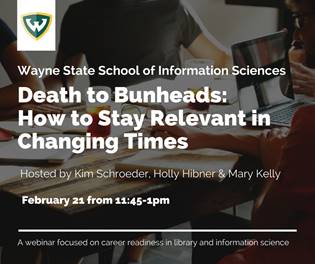 [cid:image002.jpg@01D3A6FC.0EC9EC40]It's time for another SIS Lunchtime Webinar! Grab your lunch and learn with us on Wednesday, February 21, 2018 11:45 AM - 1:00 PM EST. RSVP here to receive the webinar access link: https://rsvp.wayne.edu/sis-lunch-webinar-death-to-bunheads-how-to-stay-relev... Join alumnae Holly Hibner and Mary Kelly as they present Death to Bunheads - How to Stay Relevant in Changing Times. Holly and Mary, authors of the blog awfulibrarybooks.net and the recently published book "Taking Your Library Career to the Next Level", will share insights about professional readiness in the LIS world. Kim Schroeder, SIS Career Advisor, will also present a brief session on SIS career resources for both students and alumni. Questions? Contact Christine Ayar Illichmann, SIS Communications and Engagement Coordinator at av8728@wayne.edu<mailto:av8728@wayne.edu>.