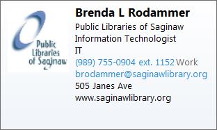 On Fri, Oct 3, 2014 at 8:24 AM, Brenda Rodammer < brodammer@saginawlibrary.org> wrote: