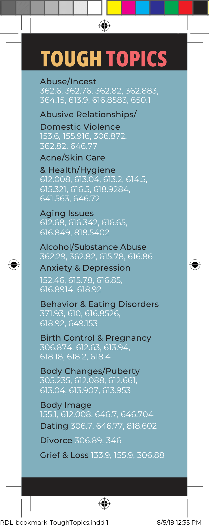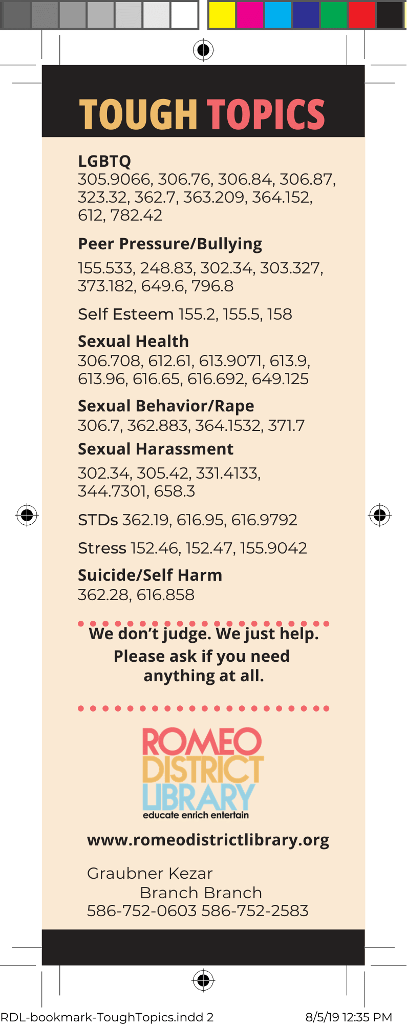 We in Romeo created a Tough Topics bookmark several years ago. I've attached it here. Lieca Hohner Romeo District Library On 2025-06-12 12:00 pm, michlib-l-request@mcls.org wrote:
