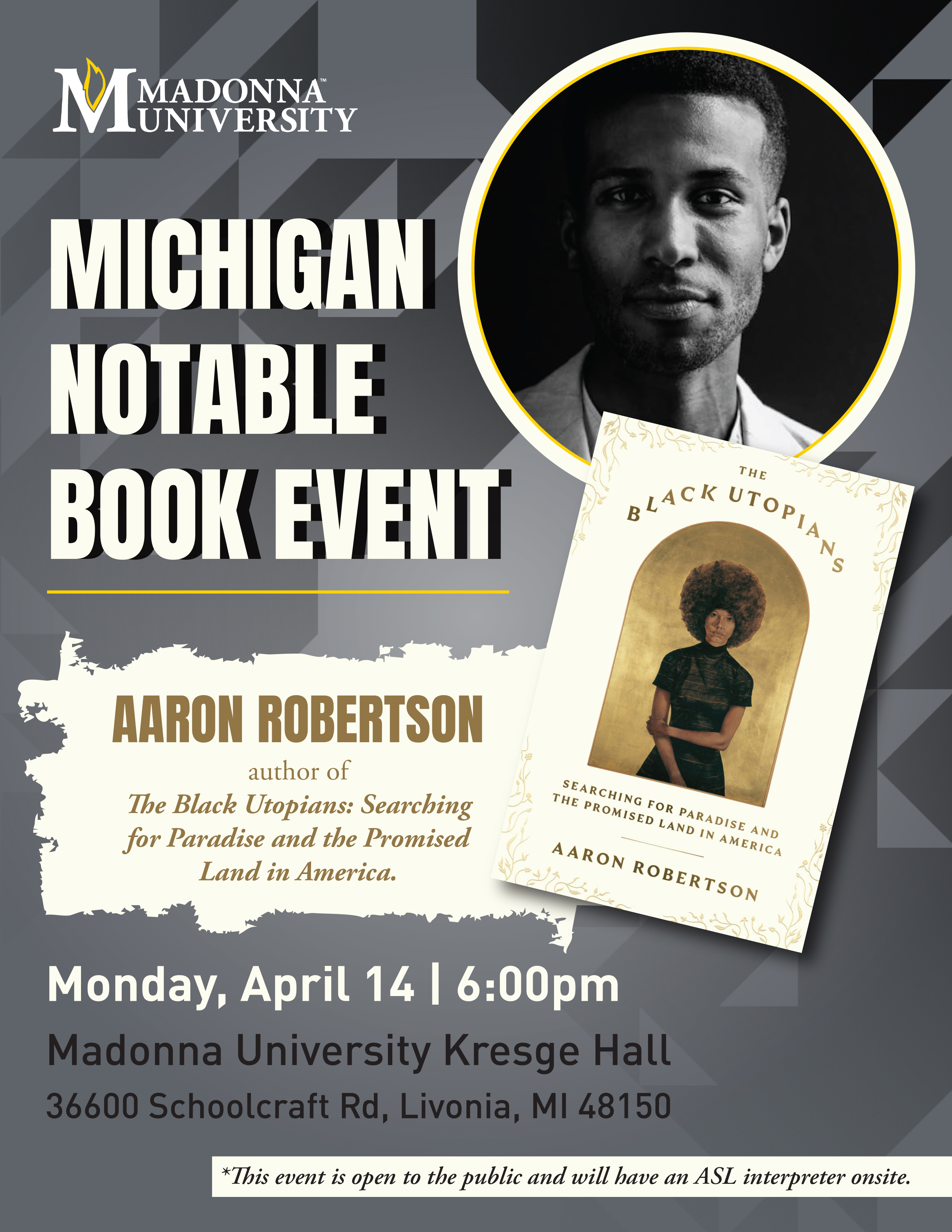Good morning, The Madonna University Library invites you to a Michigan Notable Book reading and conversation with Aaron Robertson, author of The Black Utopians: Searching for Paradise and the Promised Land in America. This event takes place on Monday, April 14 at 6pm in Kresge Hall, at Madonna University (36600 Schoolcraft Rd, Livonia). This event is open to the public and will have light refreshments and an ASL interpreter onsite. Aaron Robertson is a writer, editor, and translator from Italian. His nonfiction debut, The Black Utopians (FSG, 2024), was named a finalist for the 2024 Los Angeles Times Book Prize in History and a best book of the year by The New York Times, The New Yorker, The Washington Post, TIME, and others. His translation of Beyond Babylon by Igiaba Scego was shortlisted for the 2020 PEN Translation Prize. He is currently working on his first novel. We hope to see you there! [cid:37f4b812-92c7-498a-bfe6-9849e5aa1e85] Josh Olsen (he/him) Director of Library Services Madonna University jolsen@madonna.edu 734-432-5684