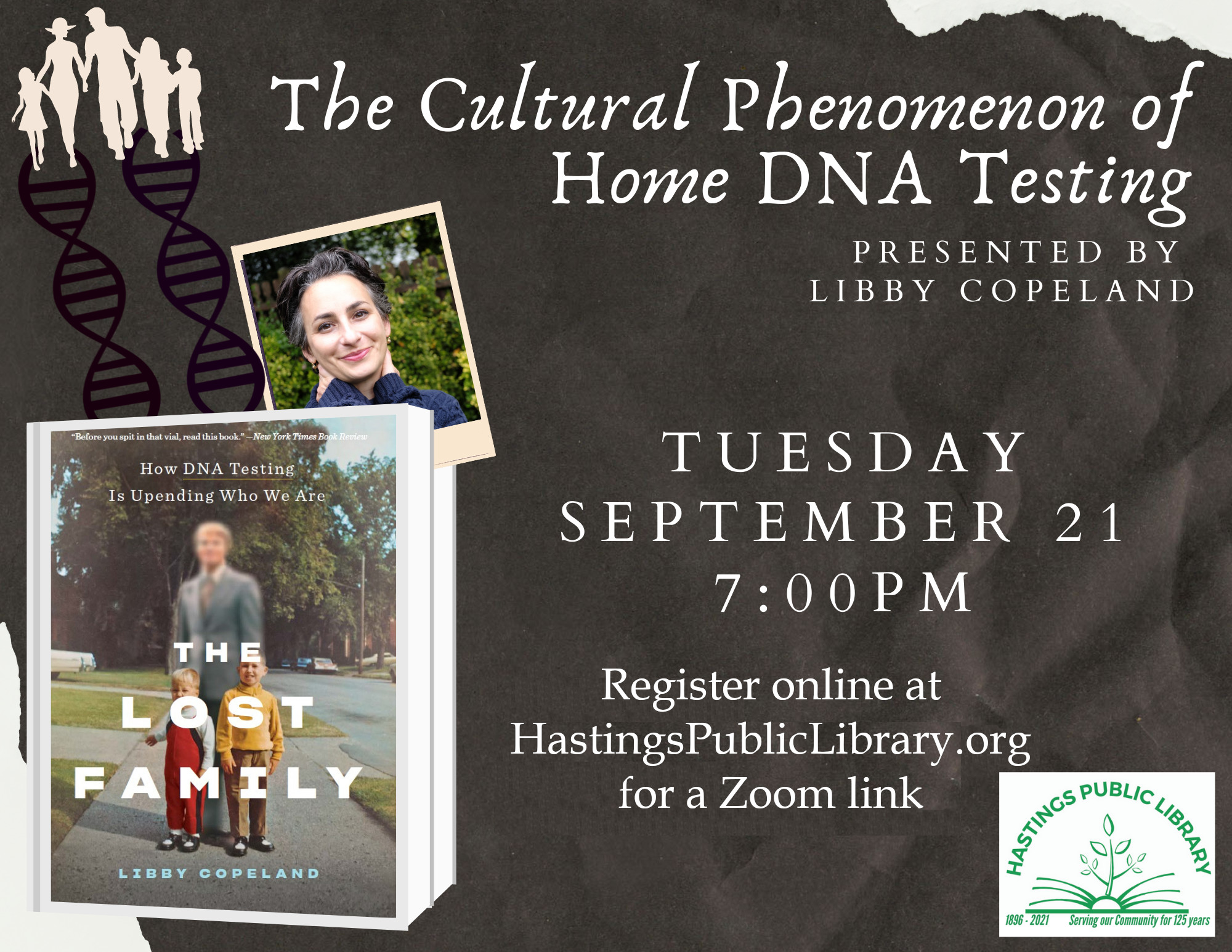 Hastings has a free zoom event coming up we'd like to share with you! The Cultural Phenomenon of Home DNA Testing To Be Presented by Libby Copeland Over Zoom. Register at https://www.hastingspubliclibrary.org/news-events/news/libby-copeland-author... The presentation will explore the extraordinary cultural phenomenon of home DNA testing, which is redefining family history. It will draw on Libby Copeland's years of research for her new book The Lost Family: How DNA Testing is Upending Who We Are (Abrams, 2020), which The Wall Street Journal calls "a fascinating account of lives dramatically affected by genetic sleuthing." With more than 37 million people having been tested, a tipping point has been reached. Virtually all Americans are affected whether they have been tested or not, and millions have been impacted by significant revelations in their immediate families. Hope to see you there! Barbara Haywood she/her/hers Marketing & Adult Programs Coordinator Hastings Public Library 227 East State St Hastings, MI 49058 269-945-4263 -- This message has been scanned by E.F.A. Project and is believed to be clean.