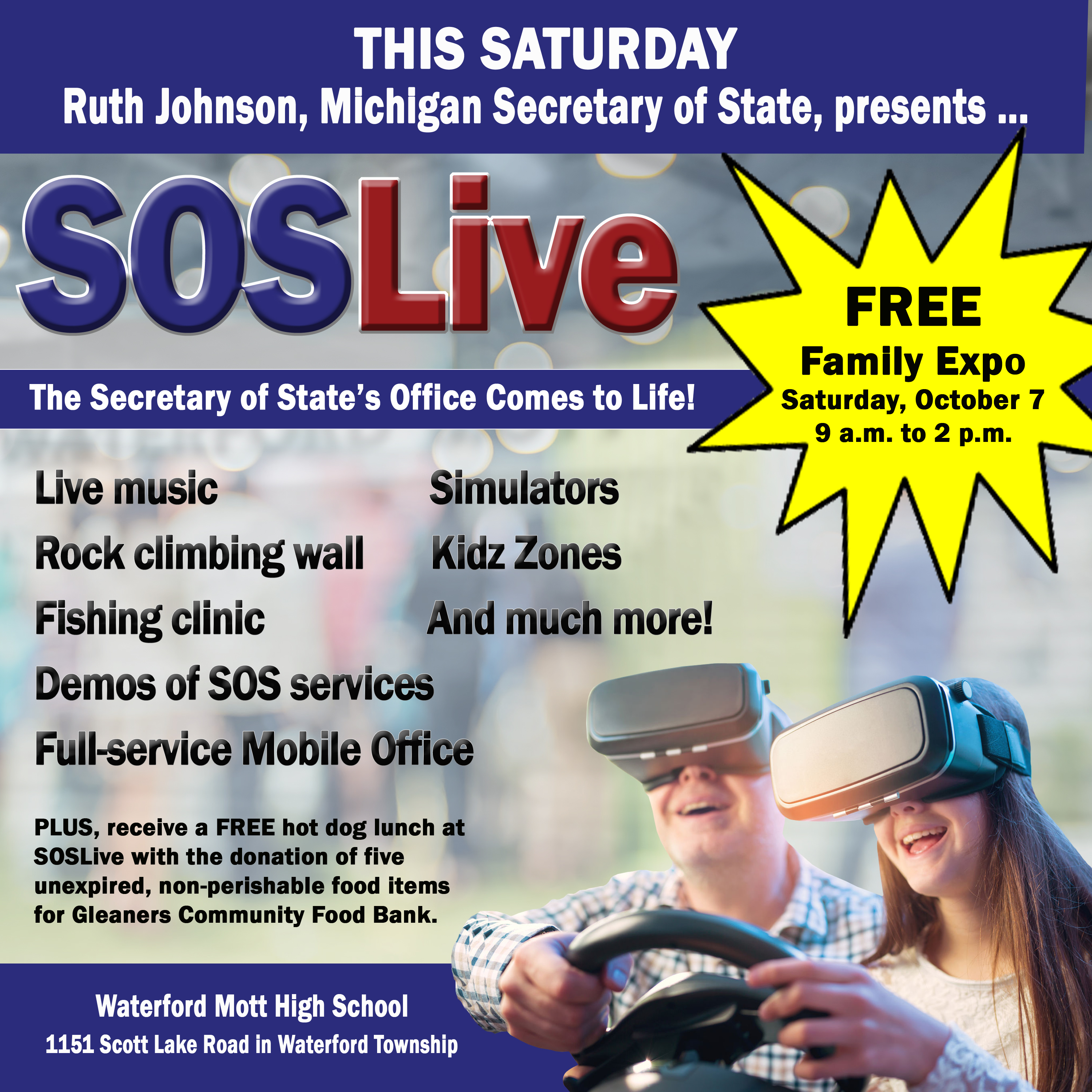 Thank you so much for whatever assistance you've provided in helping us get the word out about this Saturday's SOSLive in Waterford. What a great community effort this has been! If you have a chance to do one last push for us, we'd be so grateful. I've attached an updated image you can easily use on social media or thru your other communication channels (websites, emails, etc.). If you prefer to use text for social media rather than the attached image, you will find some suggested messages below. Again, thank you SO much for all your help! Two Text Options for Twitter Ø This Saturday is SOSLive - FREE family expo, live music, games, fun for everyone @WaterfordMott Oct 7, 9AM-2PM @MichSoS See goo.gl/LuVLbo<https://goo.gl/LuVLbo> Ø Ø This Saturday, experience MI Secretary of State's @MichSoS office like never before - Oct 7, 9AM-2PM @WaterfordMott, Go to goo.gl/LuVLbo<https://goo.gl/LuVLbo> Ø Text for Facebook Posting This Saturday, October 7, is SOSLive, a FREE family expo at Waterford Mott High School from 9 a.m. to 2:00 p.m. featuring live music, driving simulators, Kidz Zones, rock climbing wall, fishing clinic, demos of the latest SOS services, putt-putt golf, games, the full-service Mobile Office and much more. Experience the Secretary of State's office like never before! PLUS, donate five unexpired, non-perishable food items for Gleaners Community Food Bank and get free hot dog lunch. Click goo.gl/LuVLbo<https://goo.gl/LuVLbo> for the more info. @MichiganSos Cathleen Simlar Cathleen P. Simlar Communications Specialist, Executive Office Michigan Department of State Office: (517) 373-9080 Cell: (248) 761-7145 Email: Simlarc@michigan.gov<mailto:Simlarc@michigan.gov> Join My Professional network on LinkedIn<blocked::http://www.linkedin.com/pub/cathleen-simlar/18/798/235> [Description: Description: Description: SOS logo small] <http://www.michigan.gov/sos> STAY CONNECTED: [Description: Description: Description: Facebook logo]<http://www.facebook.com/MichiganSoS> [Description: Description: Description: Twitter logo] <https://twitter.com/michsos> [Description: Description: Description: YouTube logo] <http://www.youtube.com/michsosoffice> [Description: Description: Description: GovDelivery logo] <https://public.govdelivery.com/accounts/MISOS/subscriber/new>