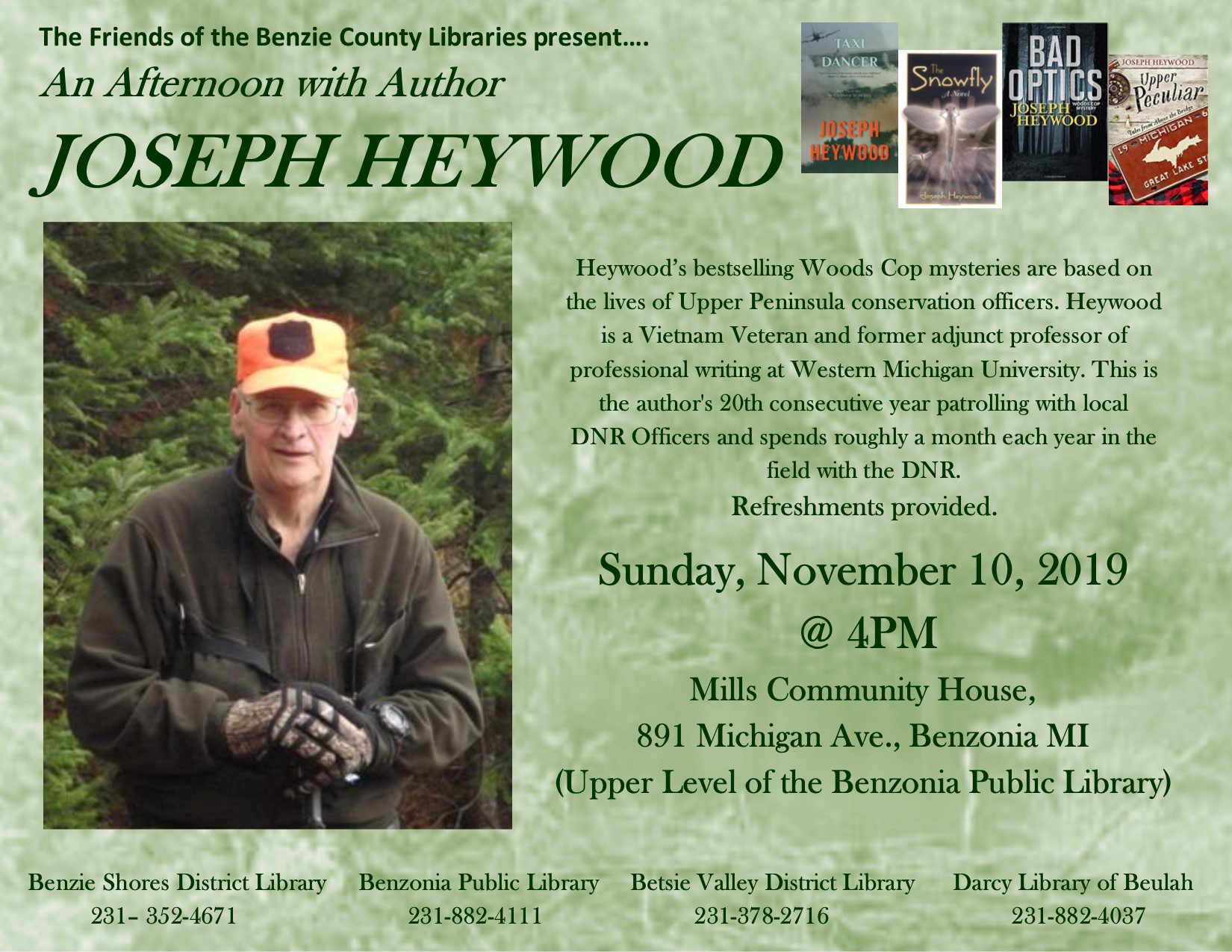 Hello, everyone! We invite everyone to join us for "An Afternoon with Author Joseph Heywood", sponsored by The Friends of the Benzie County Libraries. The event will take place at the Mills Community House, 891 Michigan Ave., Benzonia, MI, on Sunday Nov. 10, 2019 at 4PM. Heywood's bestselling Woods Cop mysteries are based on the lives of Upper Peninsula conservation officers. Heywood is a Vietnam Veteran and former adjunct professor of professional writing at Western Michigan University. This is the author's 20th consecutive year patrolling with local DNR Officers and spends roughly a month each year in the field with the DNR. Refreshments provided. Please post and share! Thank you! Michelle Guerra Betsie Valley District Library