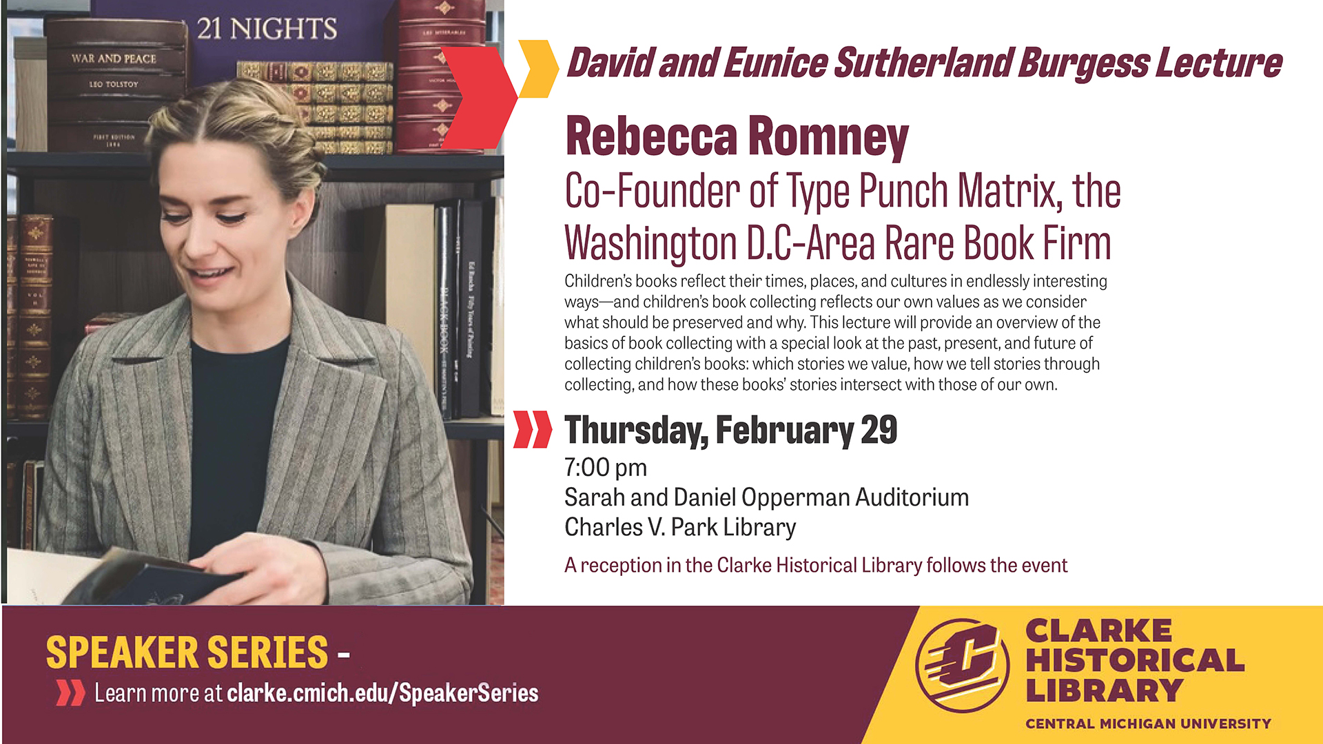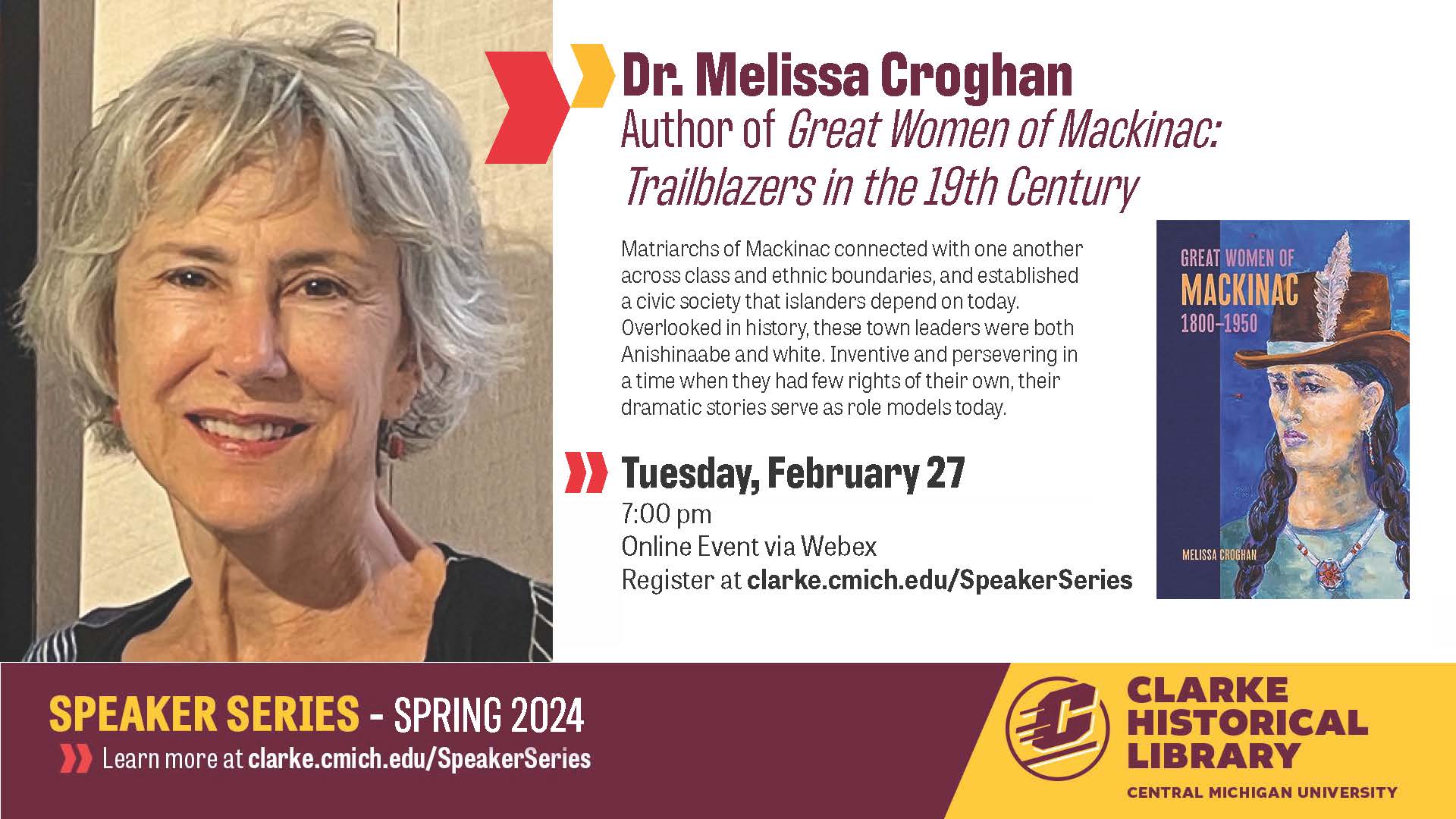 The Clarke Historical Library at Central Michigan University has two programs in the next week that might be of interest to people across the state. Attached are two virtual flyers for those who are interested. On Tuesday, February 27, we will host Dr. Melissa Croghan speaking about her Michigan Notable Book Award-winning work, Great Women of Mackinac Matriarchs of Mackinac connected with one another across class and ethnic boundaries, and established a civic society that islanders depend on today. Overlooked in history, these town leaders were both Anishinaabe and white. Inventive and persevering in a time when they had few rights of their own, their dramatic stories serve as role models today. This ONLINE program begins at 7:00 pm and will be broadcast via Webex, CMU's virtual meeting platform. Register for Dr. Croghan's presentation with this link<https://forms.office.com/Pages/ResponsePage.aspx?id=brxxyMZ8V0qk6yIwn8NJY5qCsVaZ4QBAms0rQMyXhDFURDFOOTdNUk8zSTFQODZVREo5WkswODIzOC4u>. Then, on Thursday, February 29, join the Clarke Historical Library as we welcome noted rare book dealer, Rebecca Romney, to the auditorium in the CMU Library of an in-person presentation. Ms. Romney will present, "Collecting Children's Books: Where We've Been, Where We're Going, and How You're a Part of It." Children's books reflect their times, places, and cultures in endlessly interesting ways-and children's book collecting reflects our own values as we consider what should be preserved and why. This lecture will provide an overview of the basics of book collecting with a special look at the past, present, and future of collecting children's books: which stories we value, how we tell stories through collecting, and how these books' stories intersect with those of our own. The program, which serves as the opening of our newest exhibit, Enchanting Collections/Collecting Enchantment: The Lucile Clarke Memorial Children's Library. begins at 7:00 pm and a reception will follow in the Clarke Historical Library. If you have any questions, please contact the Clarke: clarke@cmich.edu<mailto:clarke@cmich.edu> or 989-774-3864 Bryan Whitledge Public Services Librarian Clarke Historical Library Central Michigan University 989-774-3864 clarke@cmich.edu