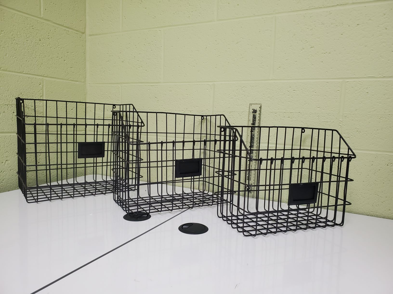 Hi All! We purchased these for a branch remodel and they just didn't fit in the new space. Each basket is mountable. There are two different kinds: Set of 3 Baskets- We have 4 sets, each set is $20 (We'll invoice you!) 14" wide x 12" tall 13" wide x 11" tall 12" wide x 9" tall Single Basket with two sections- We have 2 of these, each $10 17" wide x 11" tall (Comes with mounting screws) Just let me know! -- Tracy Logan Library Director Cadillac Wexford Public Library 411 S. Lake Street Cadillac, MI 49601 231-775-6541 logant@cadillaclibrary.org