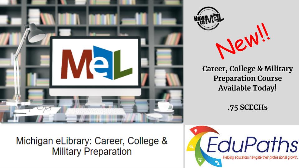 All, Learn how to use the eResources in MeL to get students ready for post-secondary pursuits through our latest course: Career, College & Military Preparation. To register for courses, go to https://bit.ly/Edu_paths. Teachers, earn .75 free SCECHs! Ann Ann Kaskinen MeL Engagement Specialist, K-12 Midwest Collaborative for Library Services 1407 Rensen Street, Suite 1 Lansing, Michigan 48910-3657 800.530.9019 ext 150 kaskinena@mcls.org