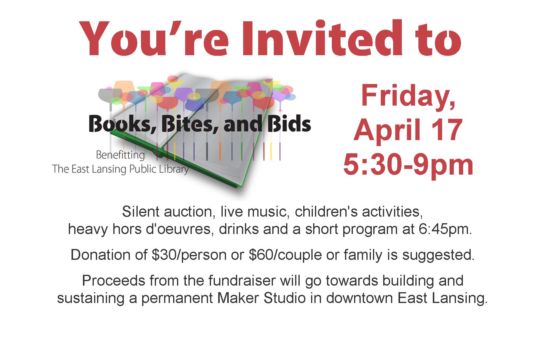 RSVP: www.elpl.org/books-bites-bids or 517.351.2420 ( tel:5173512420) Click to add a signature ( gwsig:addsig) _________________________________ East Lansing e-news is just a click away. Sign up to receive East Lansing's Dialog e-newsletter and other e-publications. Just visit http://www.cityofeastlansing.com/news today!