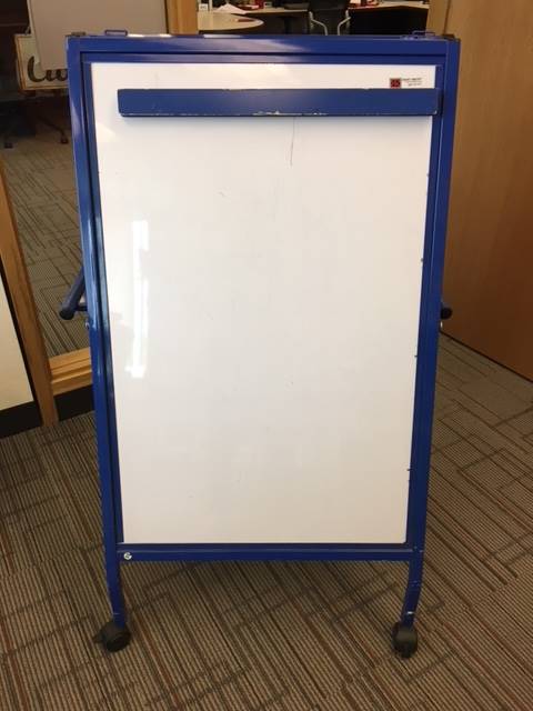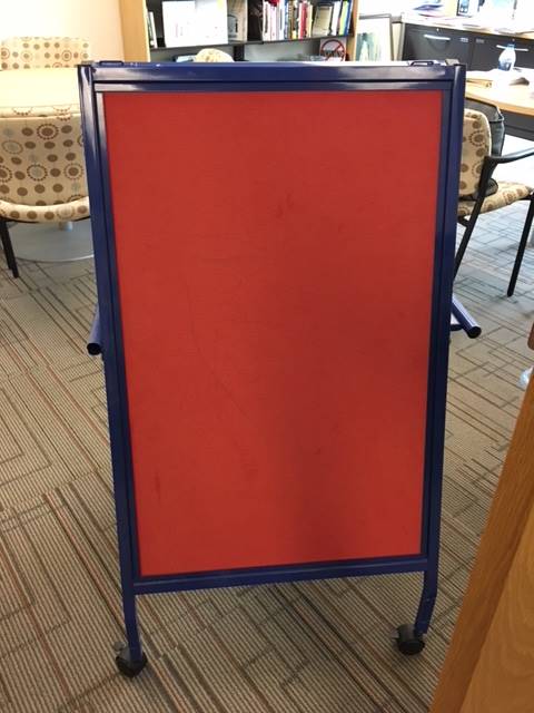 Free standing signage board on wheels. One side is felt board, the other side is a white board. Size: 44 inches tall from the floor and 24 ½ inches wide.