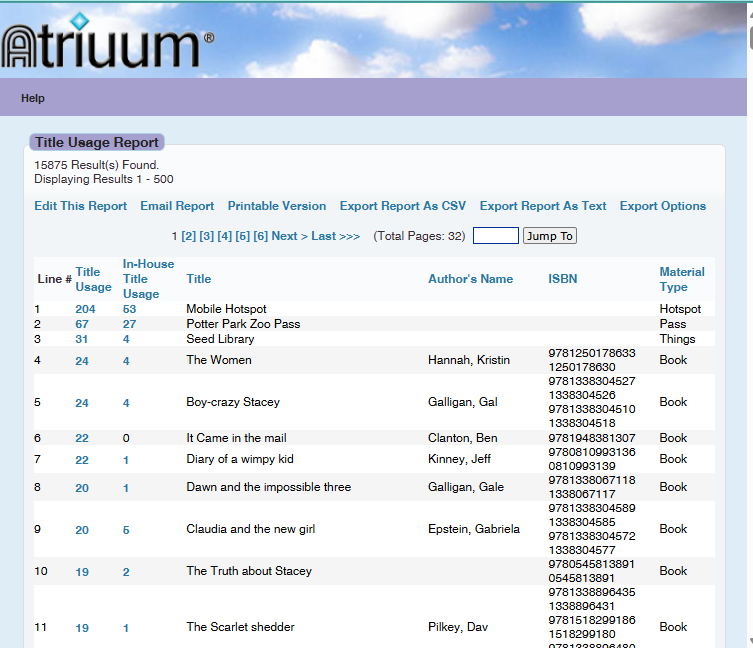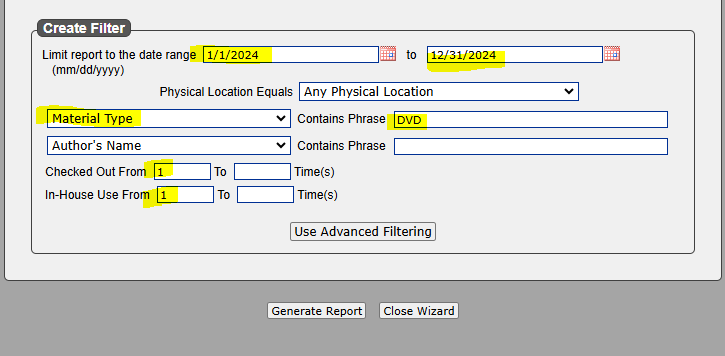 Thanks for all your responses! I have attached the screenshots for those who also need this information. Have a great day! Perri A note for the filter screen: On the filter, you can specify the date range as well as the material type. *Make sure to put at least 1 in the checked-out from box so that it excludes the items that did not circulate. -- Perri Saunders, Director White Pigeon Township Library 102 N. Kalamazoo St., P.O. Box 399 White Pigeon, MI 49099 269-483-7409 *p.saunders@woodlands.lib.mi.us <p.saunders@woodlands.lib.mi.us> * *Brighten the corner where you are.*