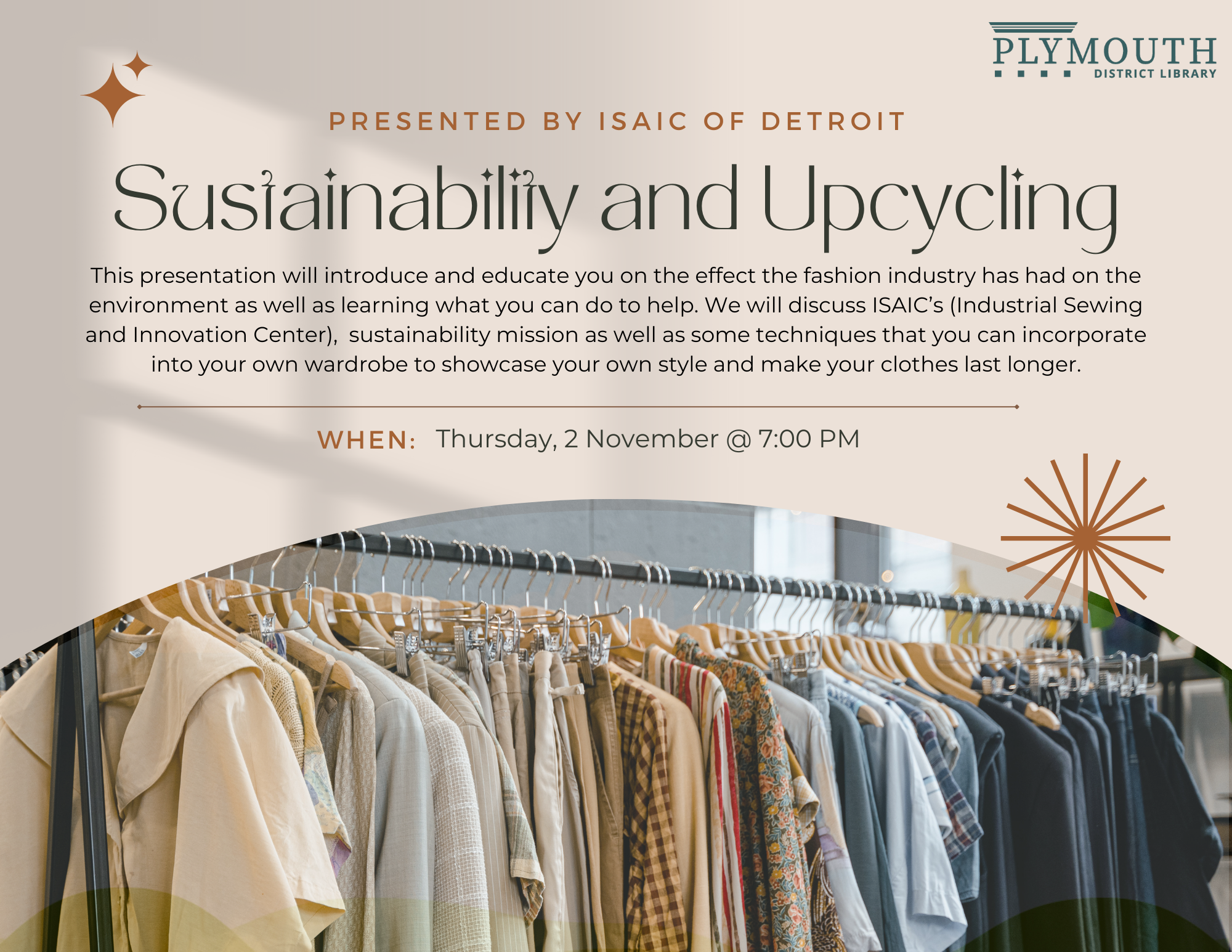 Hi all! Please feel free to share this really cool event with your colleagues and patrons. Flyer also attached! Registration requested here <https://plymouth.librarycalendar.com/event/sustainability-and-upcycling>. *Sustainability and UpcyclingThursday, November 2nd @ 7pm* At ISAIC (Industrial Sewing and Innovation Center), sustainability is a priority. This presentation will introduce and educate you on the effect the fashion industry has had on the environment as well as learning what you can do to help. We will discuss ISAIC's sustainability mission as well as some techniques that you can incorporate into your own wardrobe to showcase your own style and make your clothes last longer. Thanks! - Sarah -- Sarah Winter (she/her <https://pronouns.org/what-and-why>) | Adult Services Librarian Plymouth District Library | 223 S. Main Street | Plymouth, MI 48170 (734) 453-0750 ext. 241 plymouthlibrary.org/ Currently Reading: Little Weirds by Jenny Slate <https://www.goodreads.com/en/book/show/44284906>