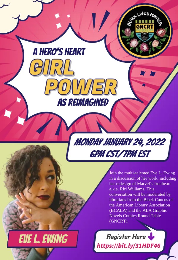 Hi everyone! Join the multi-talented *Eve L. Ewing* in a discussion of her work, including her redesign of Marvel’s Ironheart a.k.a. Riri Williams. This conversation will be moderated by librarians from the Black Caucus of the American Library Association (BCALA) and the ALA Graphic Novels Comics Round Table (GNCRT). At the webinar, we will also share details about our upcoming teen art contest, in which teens can submit designs for our 2022 Black Lives Matter, Black Literature Matters comics list. For more information on BCALA please visit: www.bcala.org/ For more on GNCRT please visit: www.ala.org/rt/gncrt The webinar will be held on Monday, January 24 at 7:00PM EST. Register at the link below. https://ala-events.zoom.us/webinar/register/WN_0Lrnjd-iSQqOKcgiPamVVg Hope to see you there! Shira Pilarski Chair of BCALA+GNCRT Collaborative Committee ______________ Shira Pilarski [hear my name <http://nmdrp.me/shirapilarski>] Youth Services Librarian II Saline District Library 555 N. Maple Rd. Saline, MI 48176 734-429-5450 ext. 3 Currently Reading <https://www.goodreads.com/user/email_signature_destination/2634685?utm_medium=reading_link&utm_source=email_signature> [image: Book Cover] <https://www.goodreads.com/user/email_signature_destination/2634685?utm_medium=cover&utm_source=email_signature> [image: Goodreads Logo] <https://www.goodreads.com/?utm_medium=gr_logo&utm_source=email_signature>Get your own email signature <https://www.goodreads.com/user/email_signature_instructions?utm_medium=gyo_link&utm_source=email_signature>