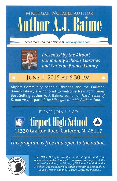 The Carleton Branch Library, Monroe County Library System, is once again partnering with the Airport Community Schools Libraries and welcoming one of the Michigan Notable Authors this year. The program will be at the Airport High School at 6:30 on Monday June 1. Our author this year is A. J. Baime New York Times Best Selling Author. His book that was selected is The Arsenal of Democracy. Attached is a copy of the flyer. Thank you David Ross David Ross Community Librarian, North County Area Libraries Monroe County Library System, Monroe MI Carleton Branch Library, Newport Branch Library, and South Rockwood Branch Library