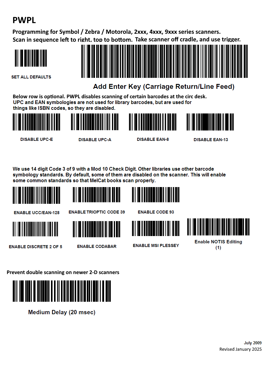I only buy Symbol / Zebra scanners because they read everything, and they are extremely programmable. The LS2208 that ULINE sells is my preferred 1D scanner for our library. Attaching my programming sheet for use with Symbol / Zebra / Motorola 1D scanners. If you choose to use it, you'll need to print the sheet, as 1D readers generally cannot read from a computer screen. The product manual is where I pulled these from. The manual contains a bunch of other options for programming as well. If you don't like a setting, you can often toggle it off, or return the device to its default settings. Customizations: * Our ILS requires the scanner to do a carriage return after entering the barcode. * I disable ISBN and EAN/UPC barcode types to prevent circ staff from accidentally scanning those instead of the item barcode. I leave them enabled for tech services staff who use the ISBN and UPC to search for bib records. * Finally, I enable some other barcode types that other libraries use. ~Bruce ---- [cid:image001.png@01DBE5BB.BB2E7270] Bruce MacDonald Head of Technology / Assistant Director Peter White Public Library<https://www.pwpl.info/> 217 N. Front St. Marquette, MI 49855 906-226-4307 Direct Dial 906-228-9510 Library Main Number 906-226-1783 Library Fax bmac@pwpl.info<mailto:bmac@pwpl.info> From: Michlib-l <michlib-l-bounces@mcls.org> On Behalf Of Library Director via Michlib-l Sent: Tuesday, June 24, 2025 6:04 PM To: michlib-l@mcls.org Subject: [Michlib-l] Barcode scanners Hi all, Wondering if anyone has purchased a barcode scanner from ULINE that works on the different barcodes we see in libraries! I just want the assurance or confirmation that they do/don't work the way I want. I do not know what makes a scanner do all of the things to look in the specs. Anyways, I am looking for 1D barcode scanners that can handle ISBN and T (or other letters) barcodes and everything else we might encounter. Currently, we have some that can read the full ISBN number and others that can handle the T barcode type that we and other libraries have. Only one out of the five in our building does both! I already have a cart of items with ULINE, so that is preferred currently but I am open to others too. [sigemail] CONFIDENTIALITY NOTICE: This communication and any attachments may contain confidential and privileged information for the use of the designated recipient named above. If you are not the designated recipient, an employee, or agent responsible for delivering this message to the intended recipient, you are hereby notified that you have received this communication in error and that any review, disclosure, dissemination, distribution, or copying of it or its contents is strictly prohibited. If you receive this communication in error, please destroy all copies of this communication and any attachments and notify the sender immediately via phone, fax, or electronic mail. Thank you.